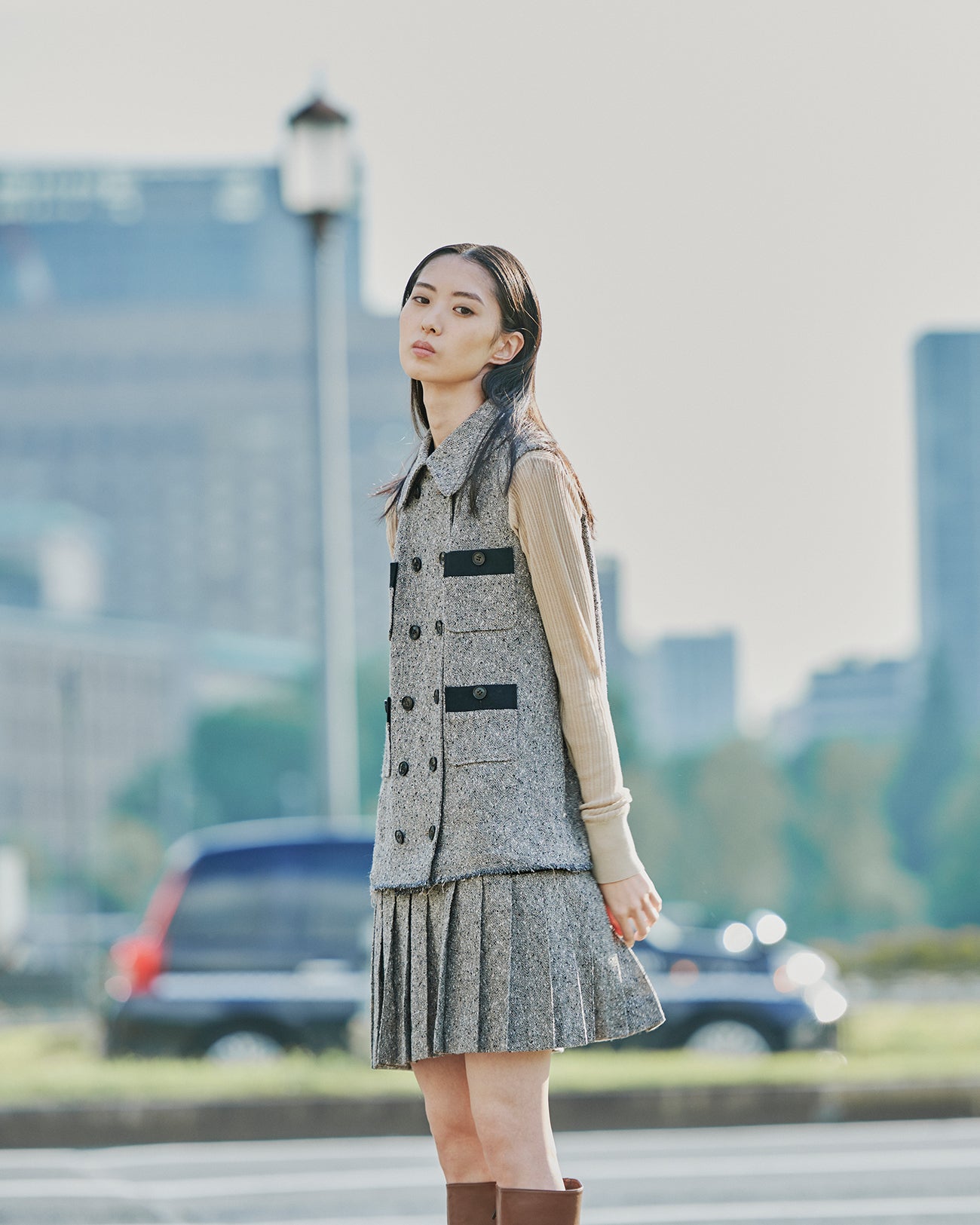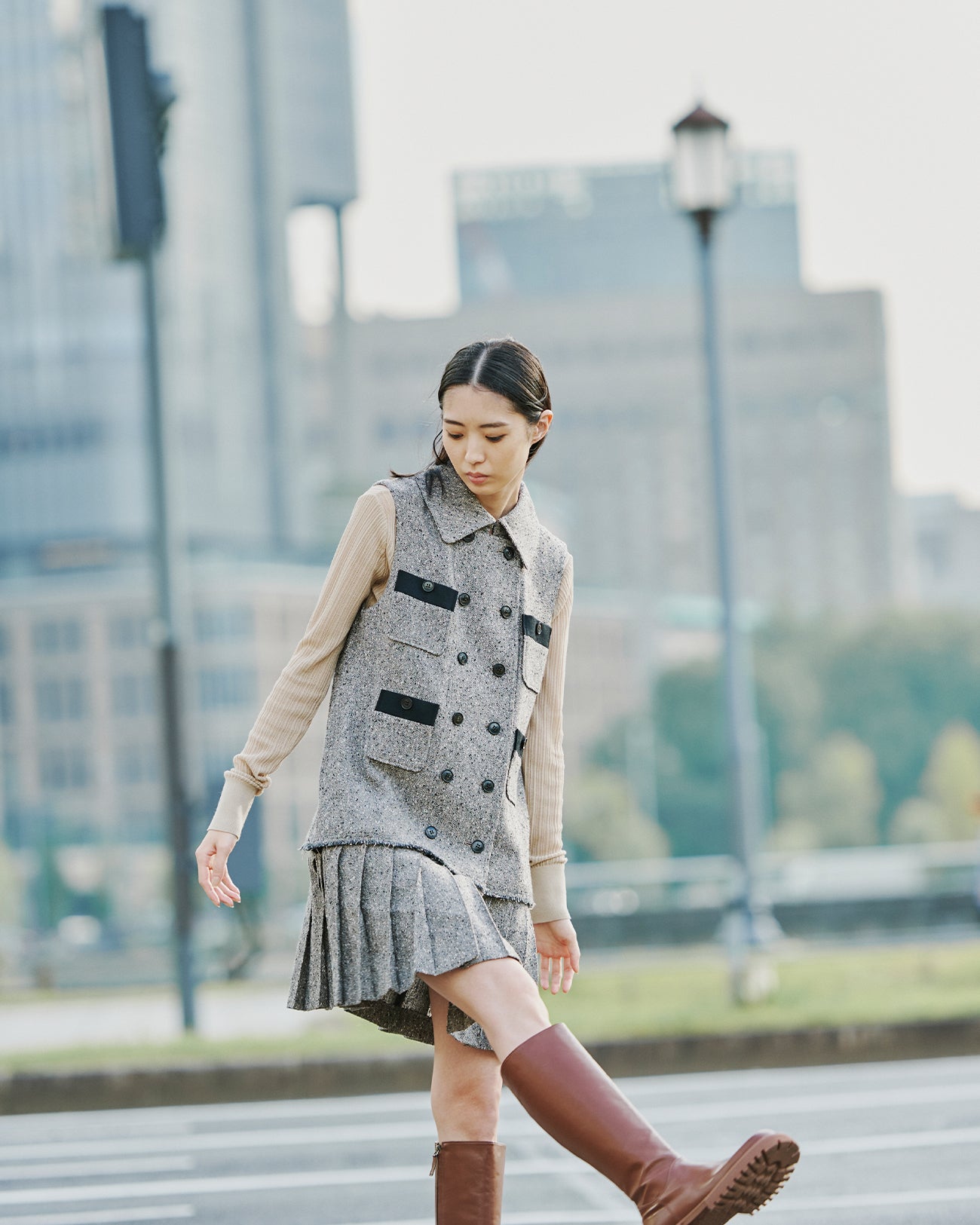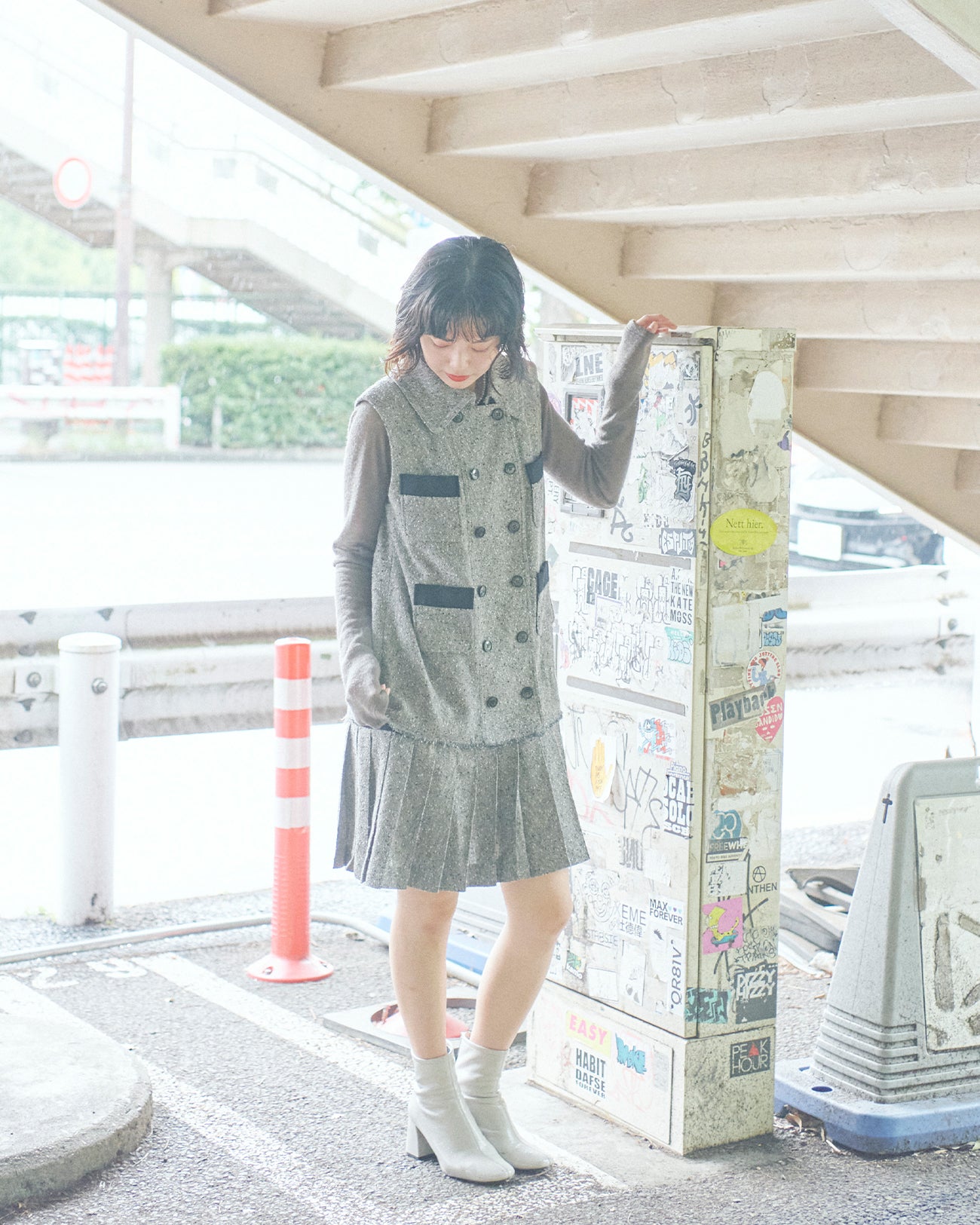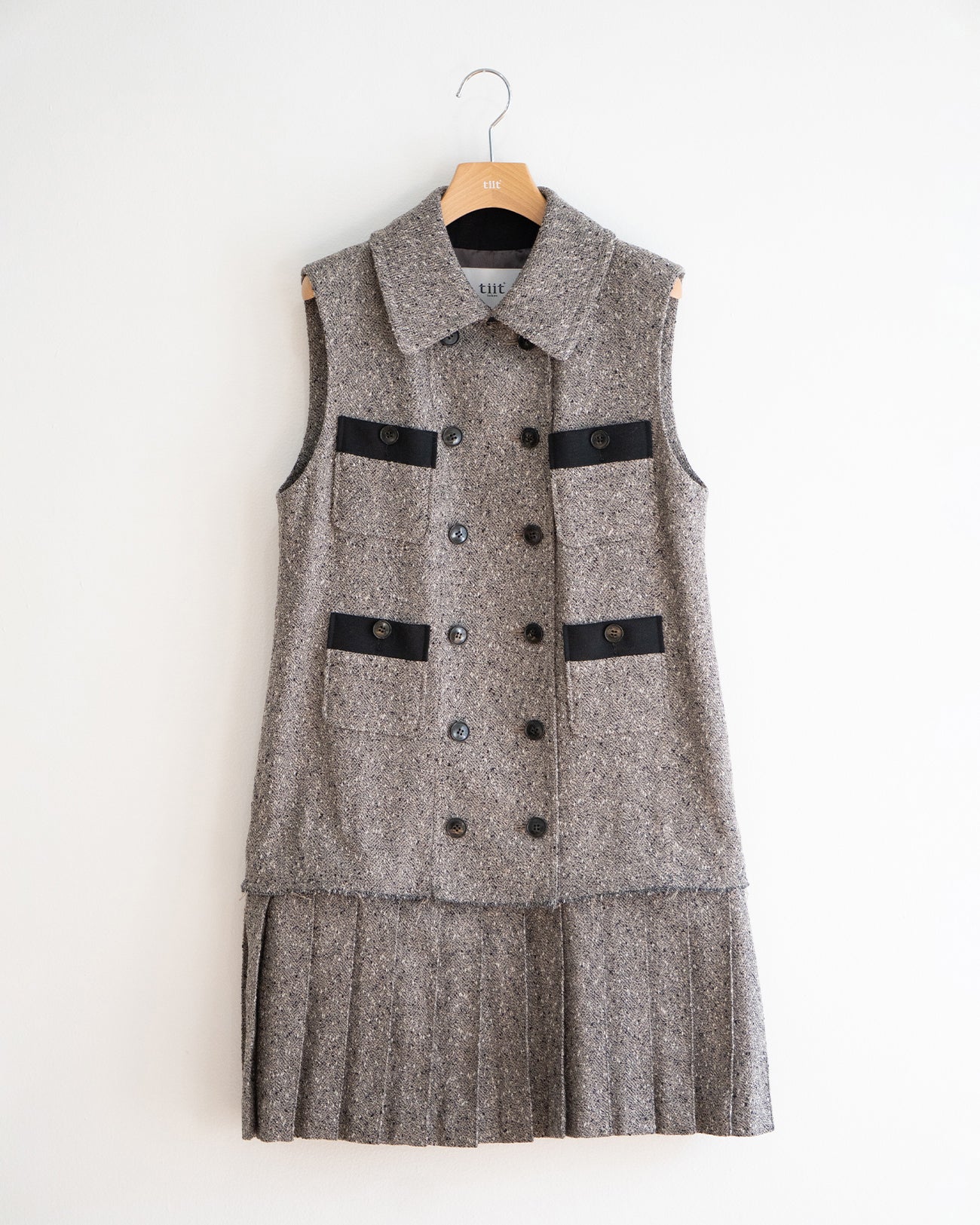ネップのある細かいヘリンボーン素材のスリーブレスミニドレスです。