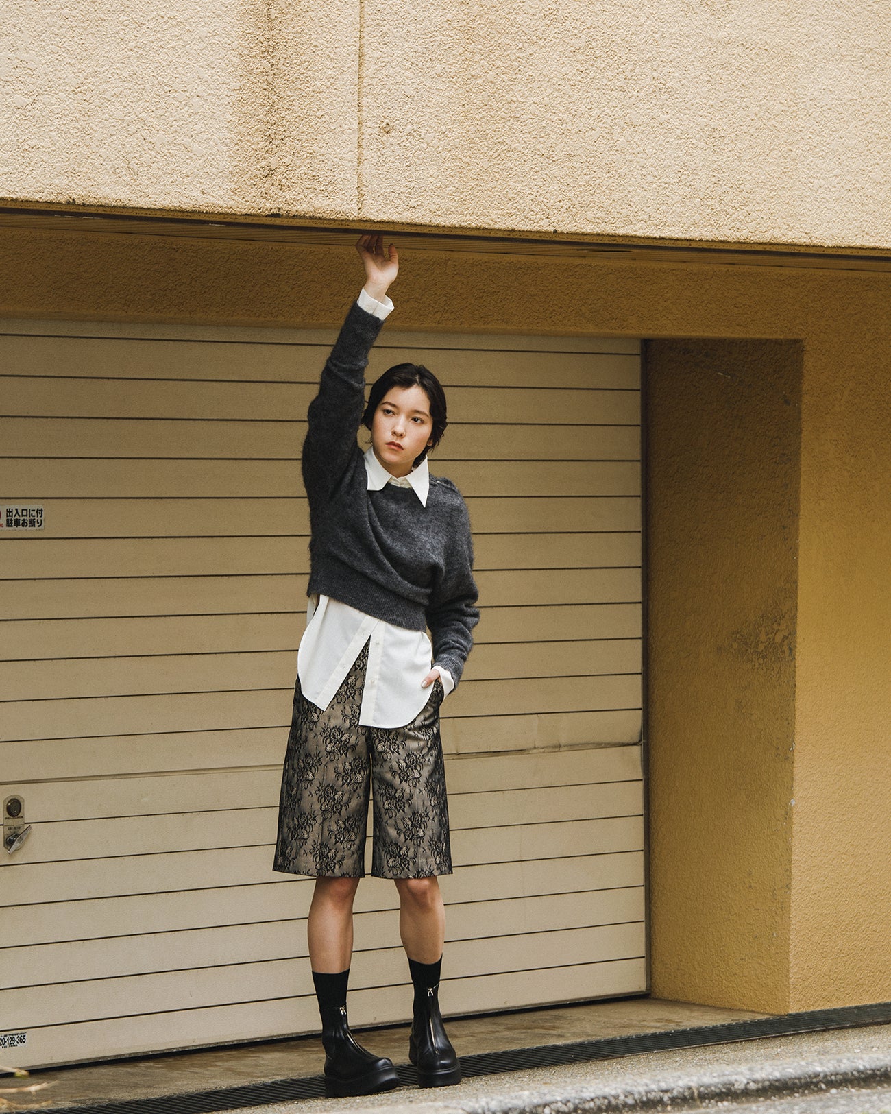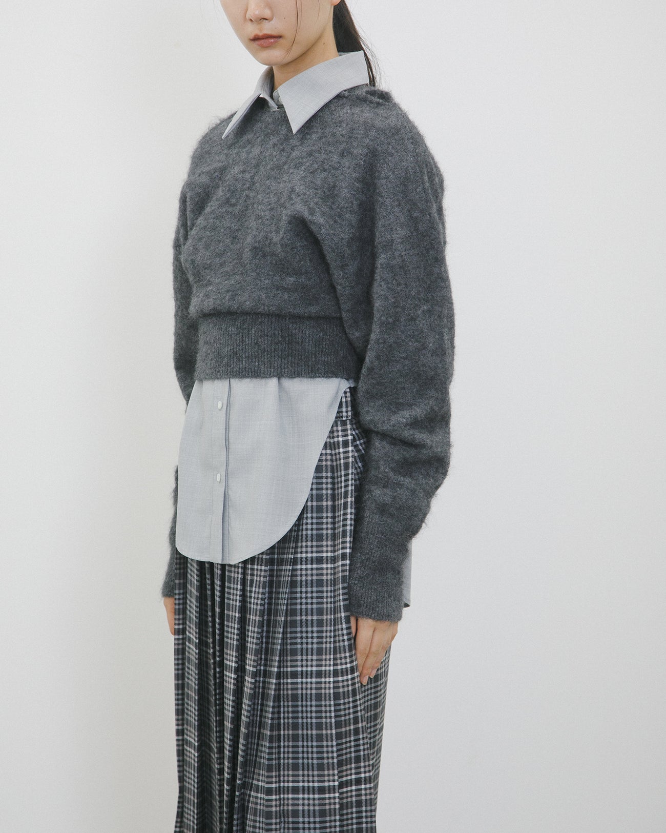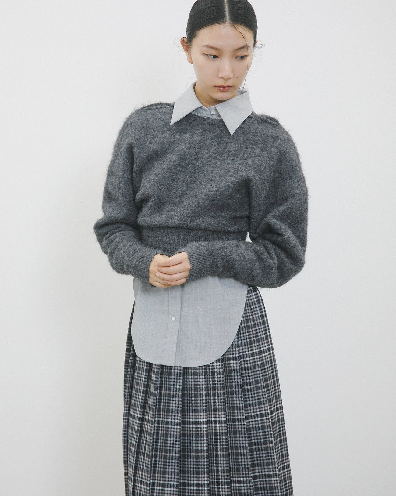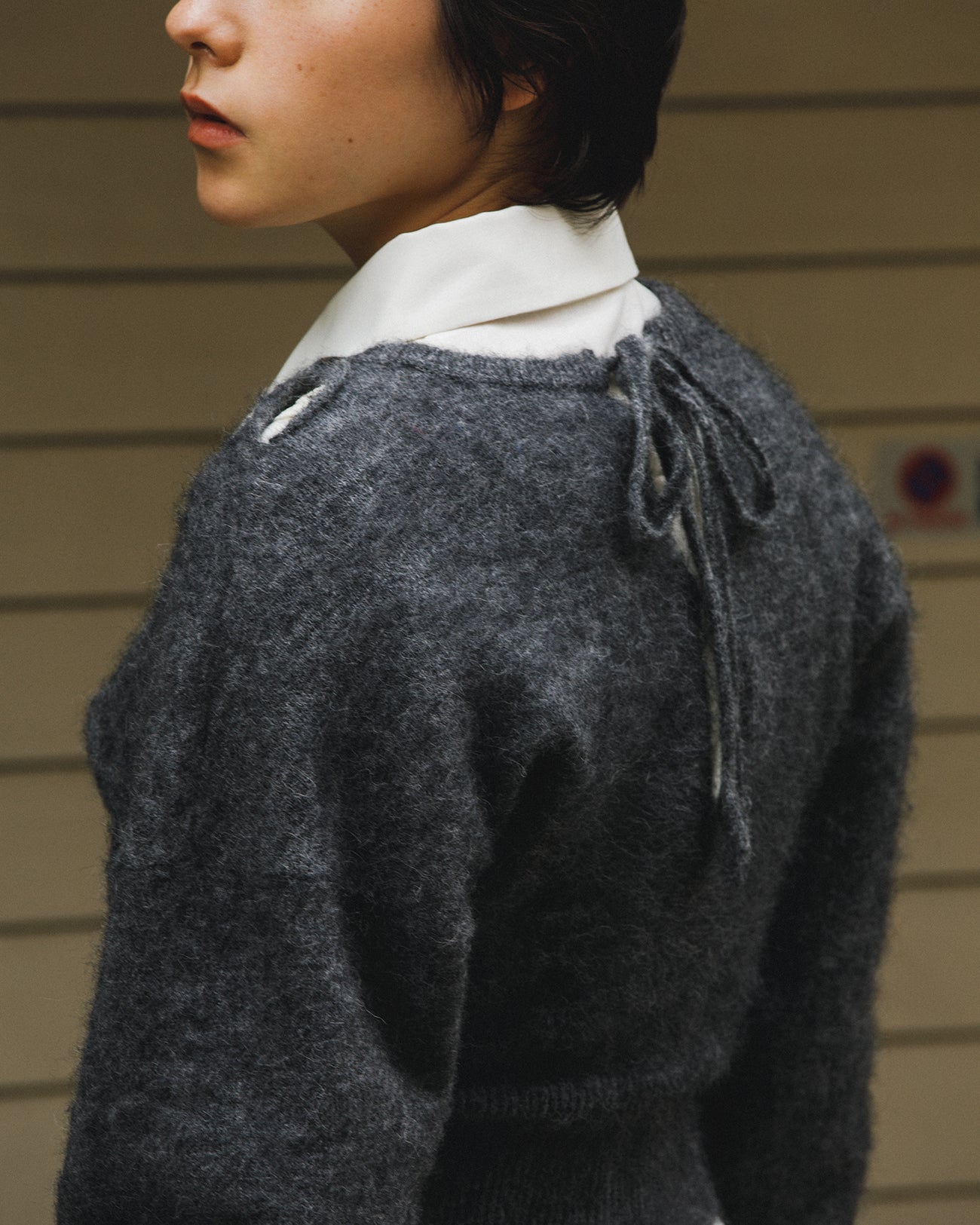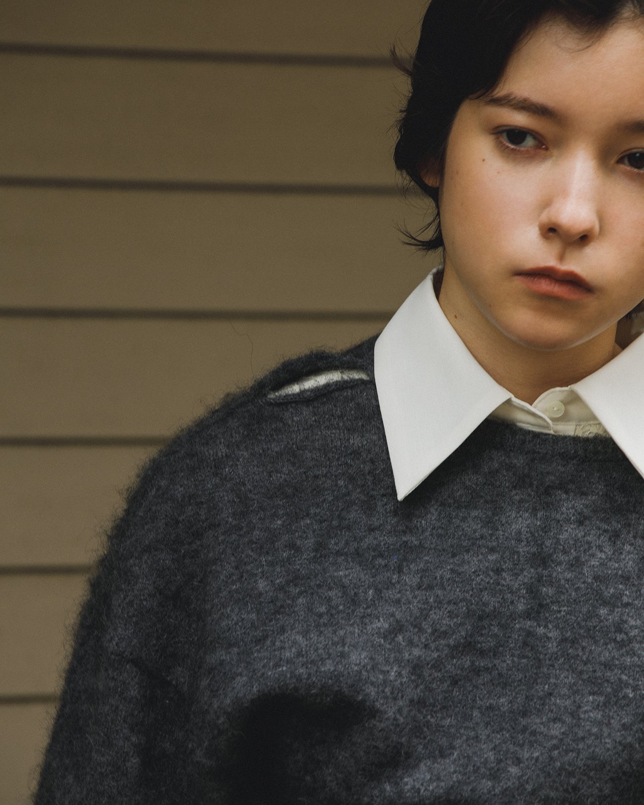 表地:アルパカ55% アクリル24% ナイロン19% ポリウレタン2% A shaggy pullover blended with alpaca, featuring a reversible design that can be worn both ways. One side has a boat-neck style, while the other features a slit with ribbon closure that can also be untied for a relaxed look. This versatility allows you to create different impressions and styling variations. The wide ribbing at the waist and cuffs creates a clean, flattering silhouette without adding bulk, while the subtle button detail along the shoulder line adds a refined accent. Main Fabric: Alpaca 55%, Acrylic 24%, Nylon 19%, Polyurethane 2% |