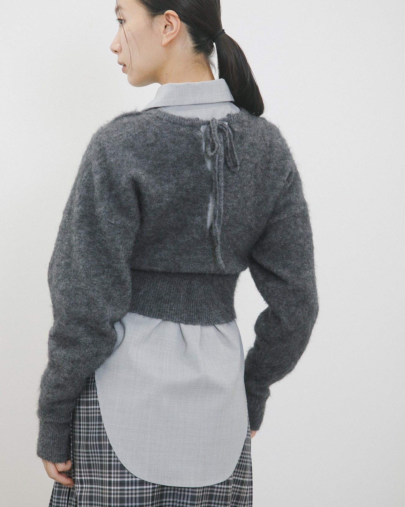 フロントはボートネックタイプとスリット&リボンあきのデザインで、リボンを解いて着用も可能です。 どちらを前にして着用もできるのでさまざまな印象でスタイリングができます。 ウエスト部分と手首が太めのリブになっているので、着太りせずスッキリとした着こなしになります。 肩線のさりげないボタンあきのデザインもポイントです。