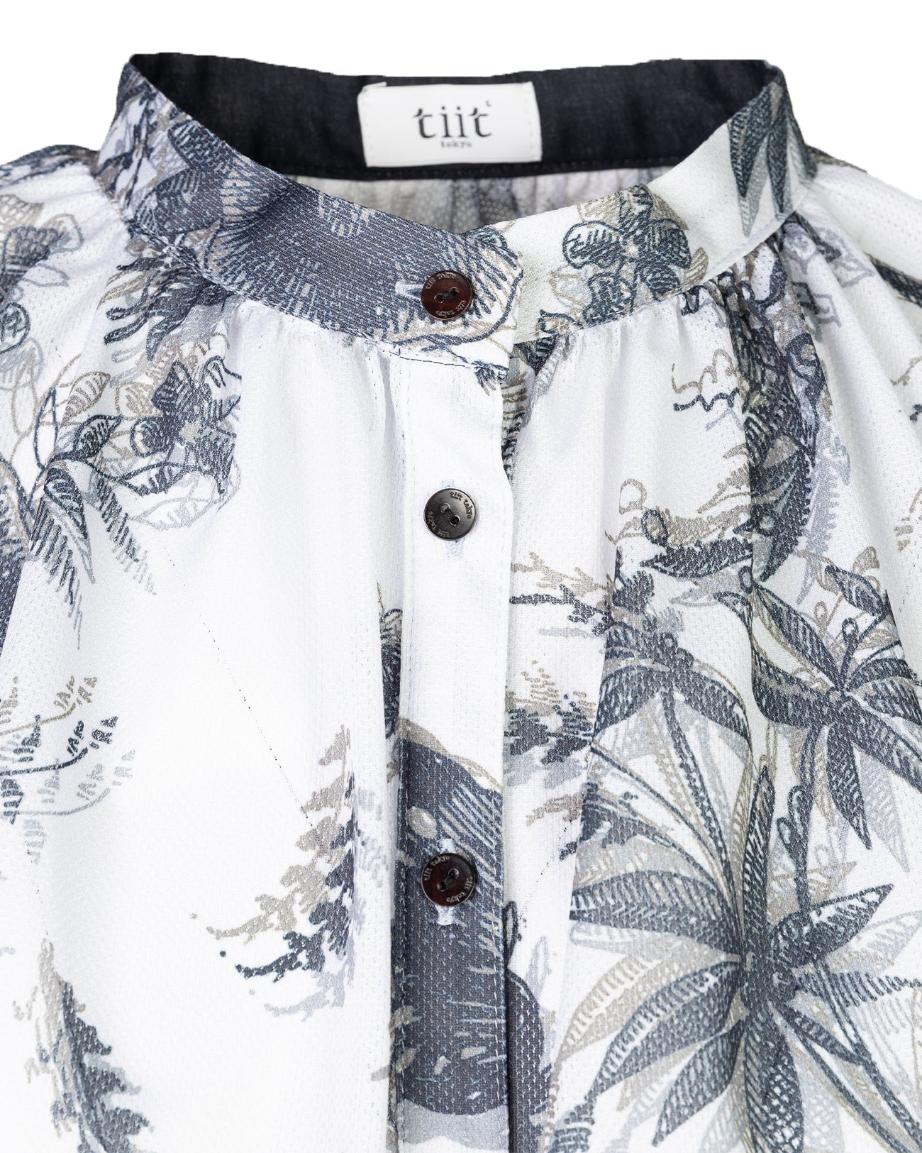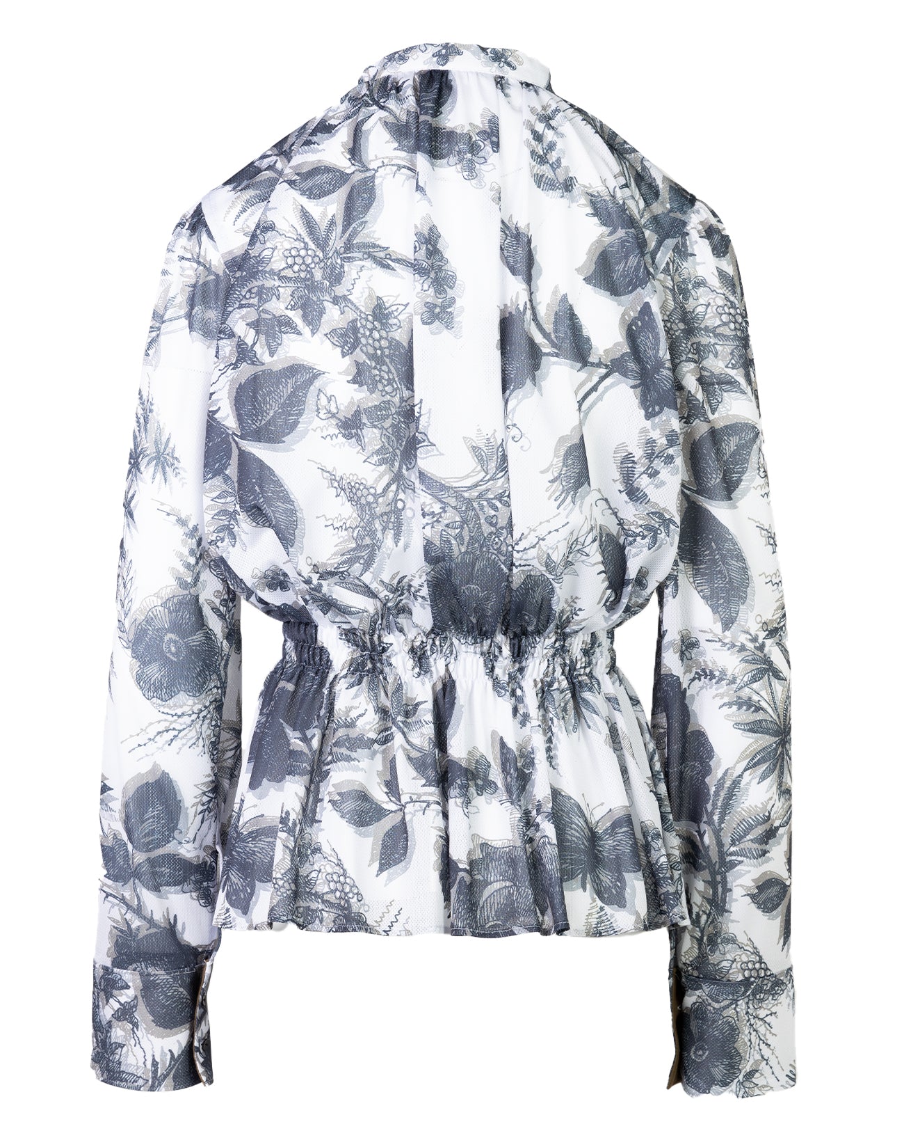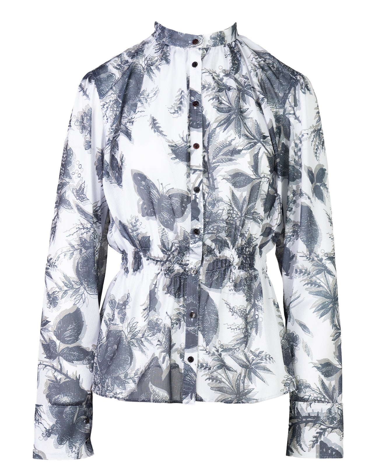 立体感のある蝶や花柄が特徴のオリジナルプリント生地を使用。落ち着きのある色合いが魅力のアイテムです。ウエストはゴムシャーリング加工が施されている為ウエストにフィットし、女性らしいシルエットになります。袖口の裏側はバイカラーになっており、折り上げての着用もおすすめです。同シリーズでワンピースの展開もございます。