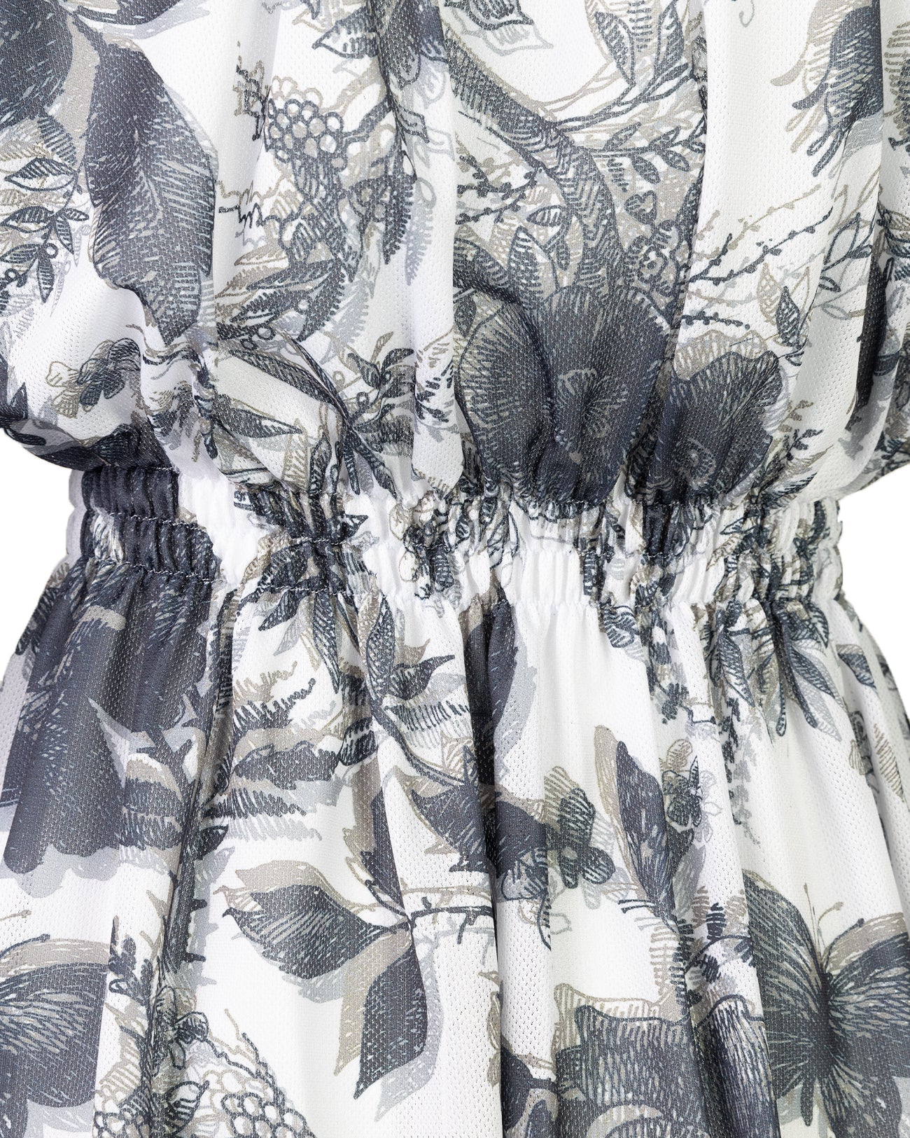 Original printed fabric featuring three-dimensional butterflies and flower patterns is used.The calming color is the attractive item.The waist is made of rubber shirring, so it fits the waist and has a feminine silhouette.The back of the cuffs is bicolored, so I recommend you to wear them folded up.There is also a one-piece development in the same series.