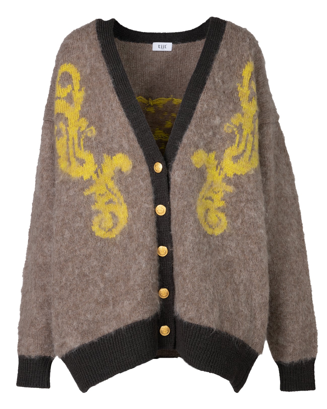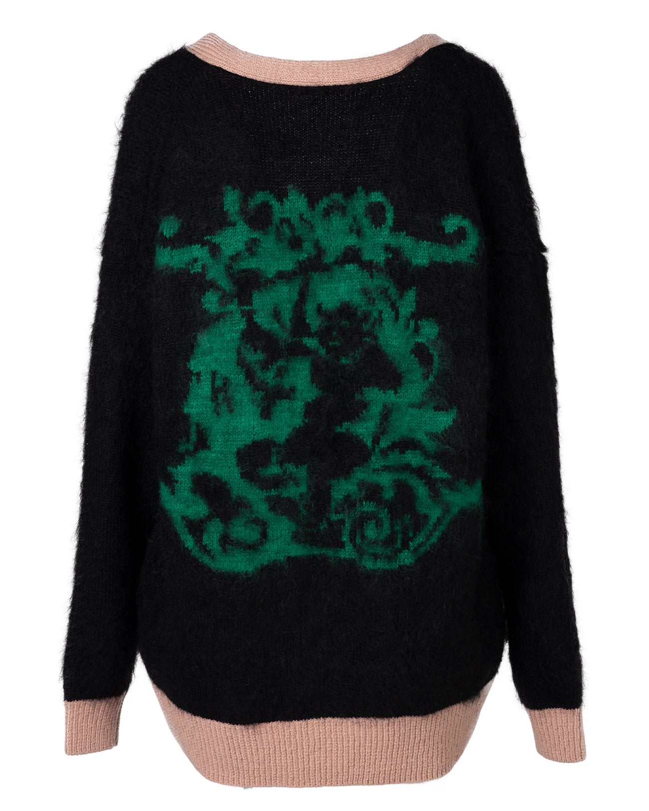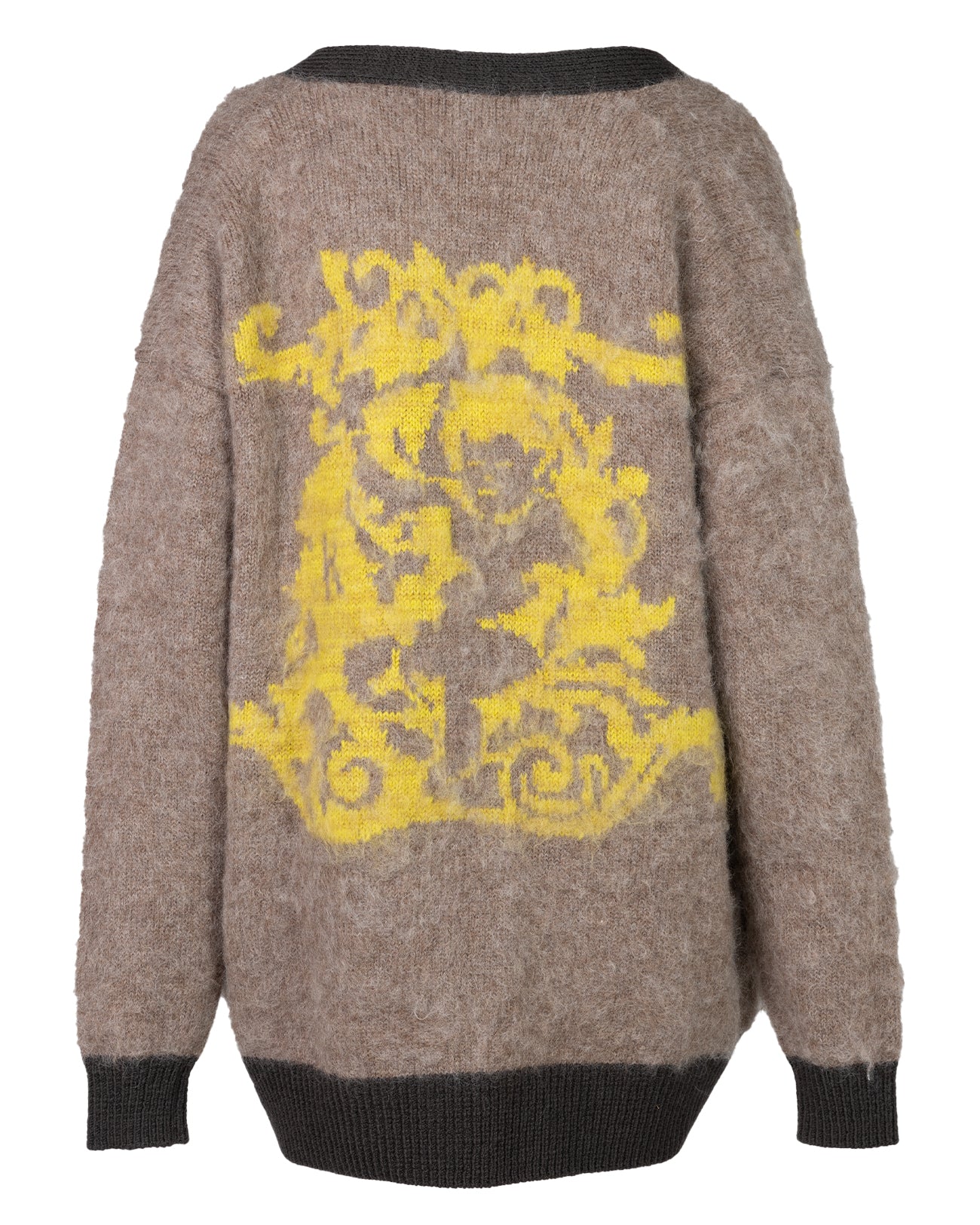 一枚一枚職人の手で編まれた特別なニットカーディガン。後ろ身には大きな天使模様が特徴的で手編みならではのふっくらとした柔らかい肌触りが魅力な商品です。
