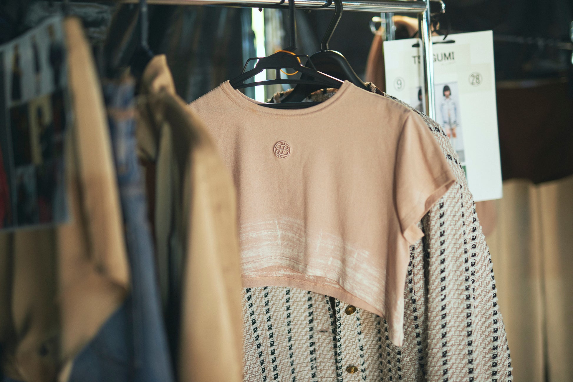 A cropped T-shirt with a boldly cut length. The sides feature a slightly longer round hem design, creating a feminine silhouette. The beige color has bleach processing around the neckline and hem, giving it a vintage-like vibe for wearing.