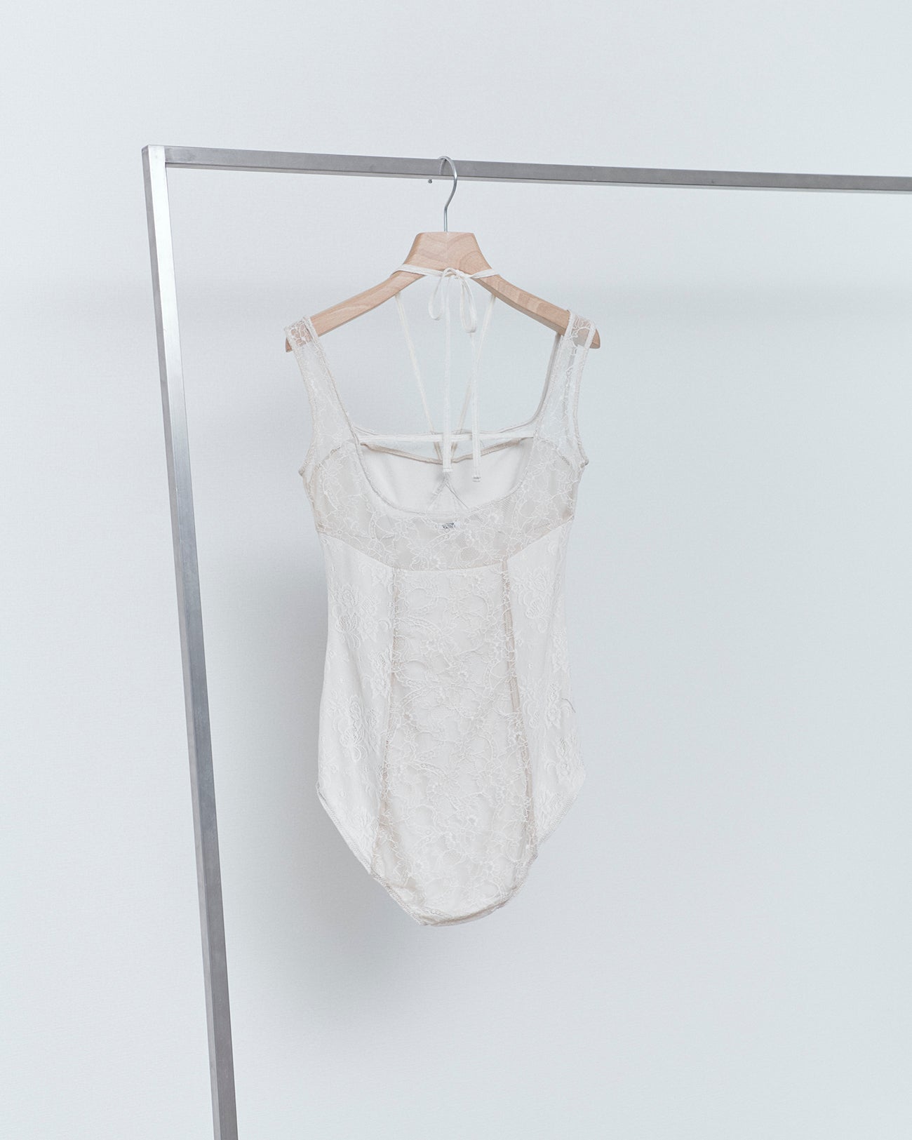 A bodysuit made with two types of delicate lace fabric. It features a design that switches between the two laces along the panel lines. With a lining included, the area from the bust down is not see-through, allowing you to wear it with confidence.