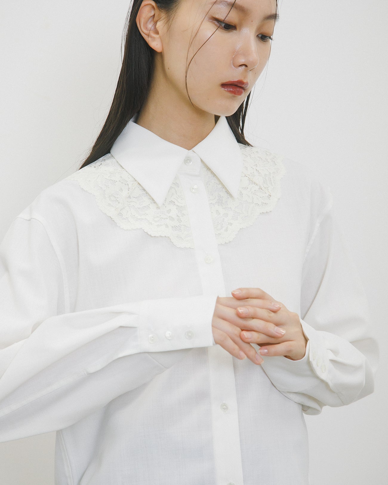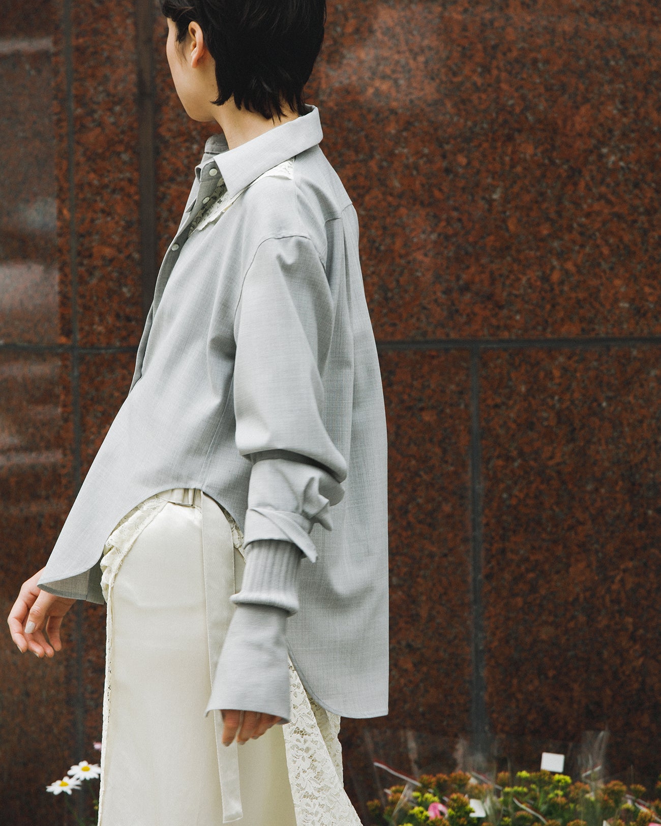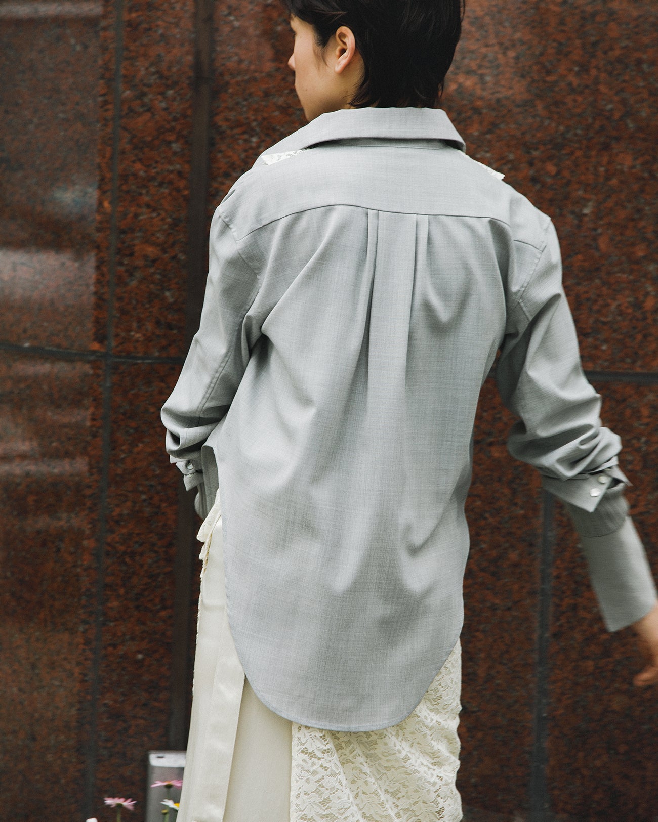 ウール混のトロ素材を使用しているので、バリッとした仕上がりになり、綺麗めな印象で着用していただけます。 裾はラウンドヘムになっており脇が短いデザインなのでアウトで着用しても特別感のある1着になります。 表地:ポリエステル70% 毛30% 別布レース:レーヨン71% ナイロン29% A design shirt featuring lace details at the collar. Made from a wool-blend tropical fabric, it has a crisp texture that gives a clean and polished look. The rounded hem with shorter side lengths adds a distinctive touch, making it a stylish piece even when worn untucked. Main Fabric: Polyester 70%, Wool 30% Lace Fabric: Rayon 71%, Nylon 29% |