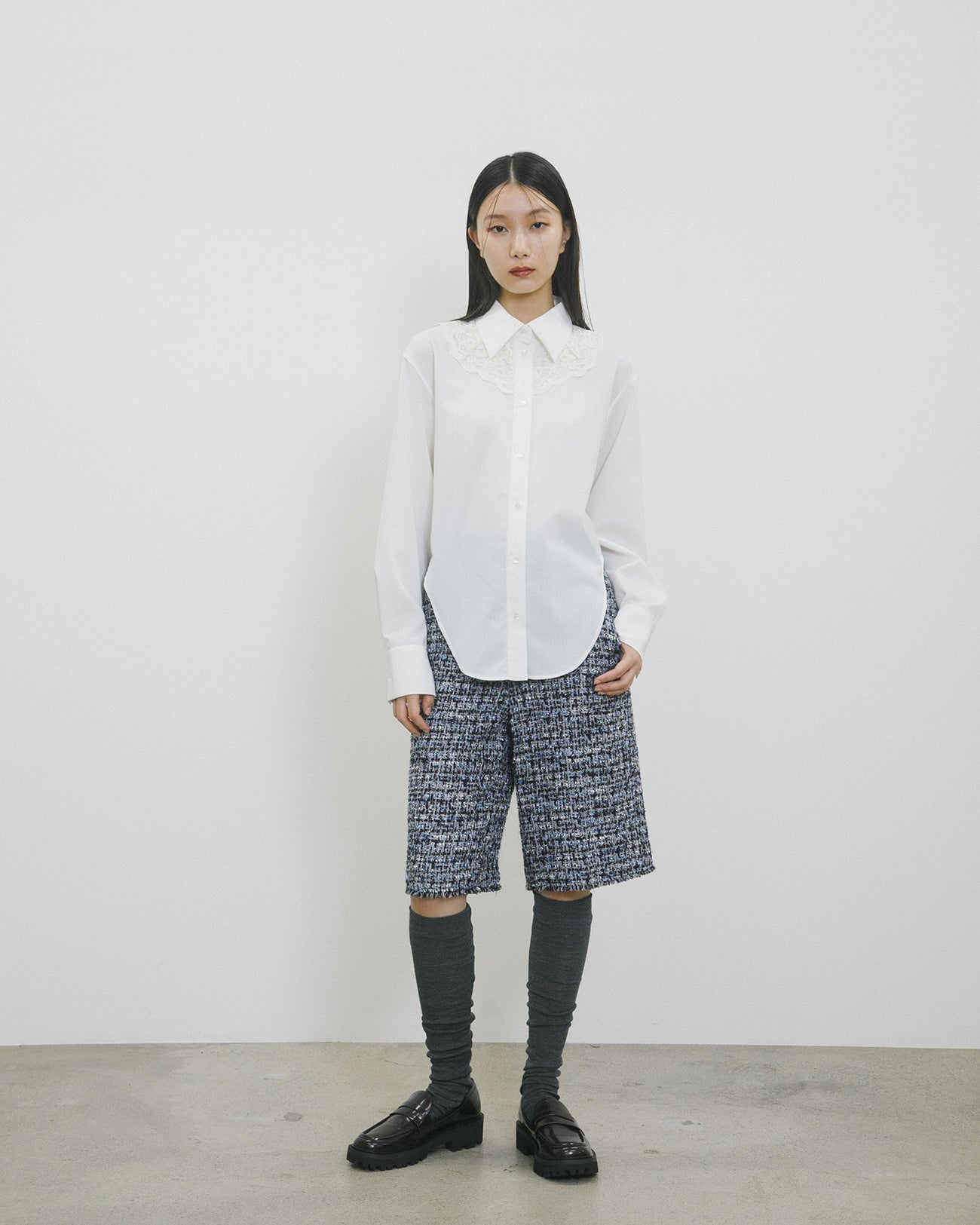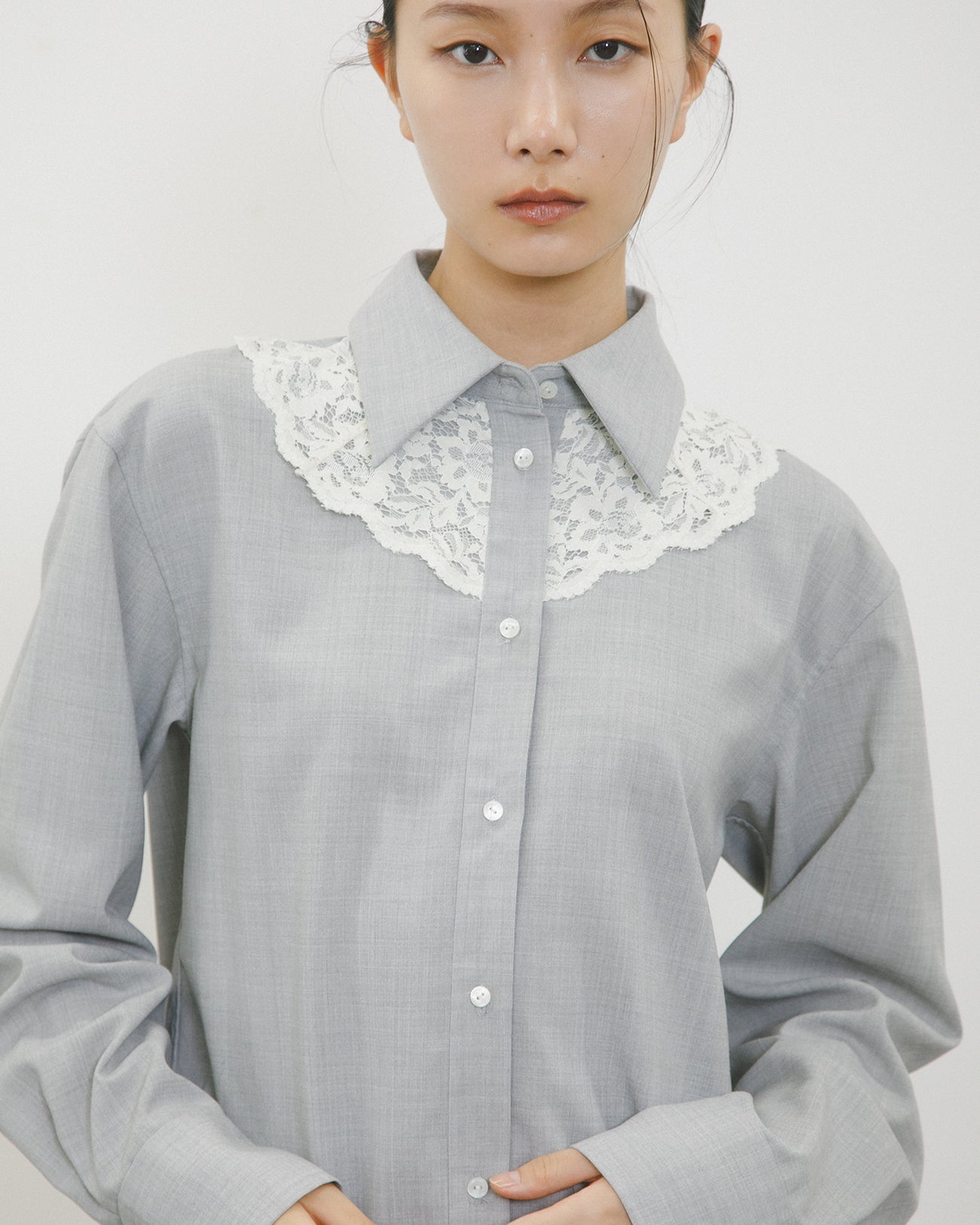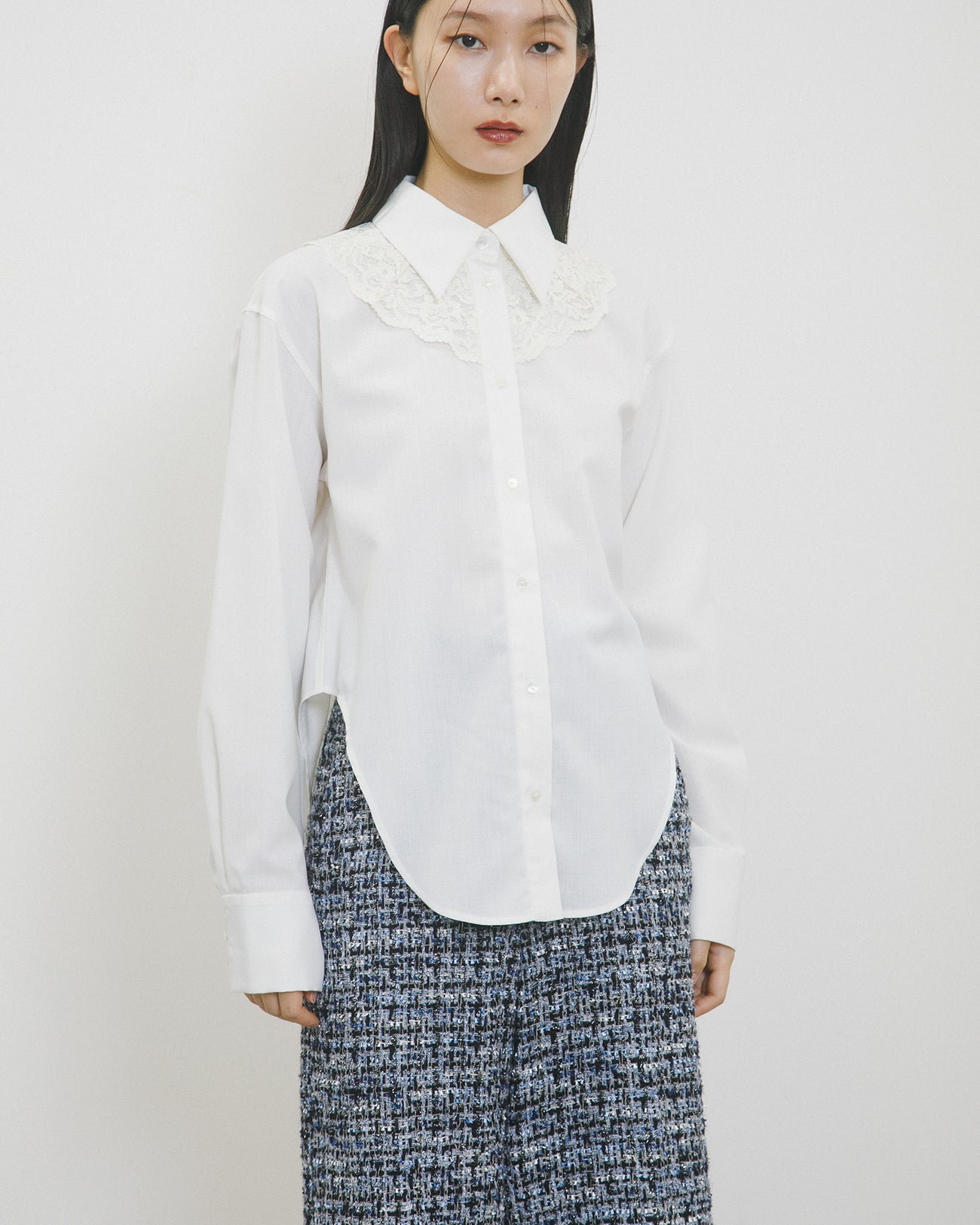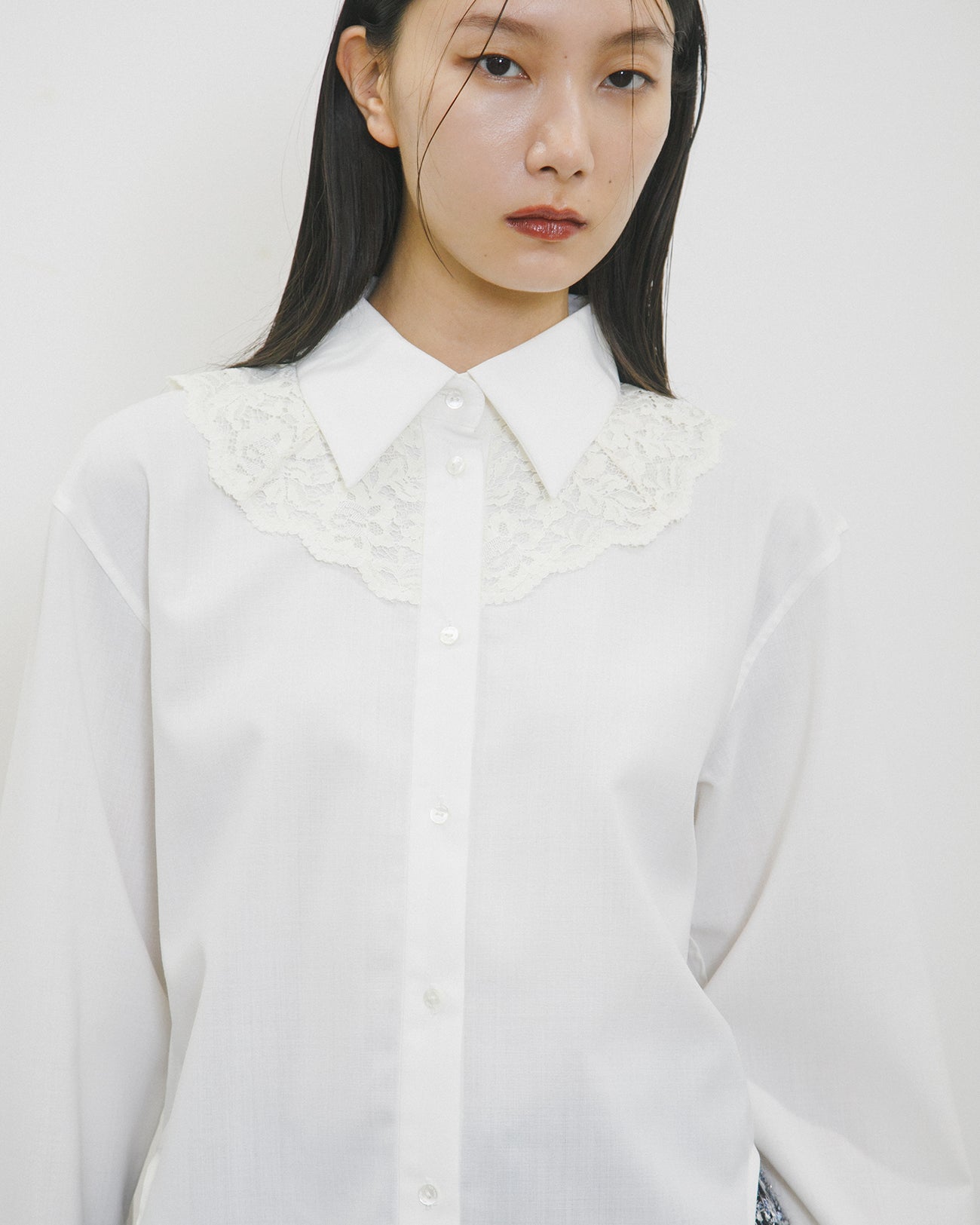 ウール混のトロ素材を使用しているので、バリッとした仕上がりになり、綺麗めな印象で着用していただけます。 裾はラウンドヘムになっており脇が短いデザインなのでアウトで着用しても特別感のある1着になります。 表地:ポリエステル70% 毛30% 別布レース:レーヨン71% ナイロン29% A design shirt featuring lace details at the collar. Made from a wool-blend tropical fabric, it has a crisp texture that gives a clean and polished look. The rounded hem with shorter side lengths adds a distinctive touch, making it a stylish piece even when worn untucked. Main Fabric: Polyester 70%, Wool 30% Lace Fabric: Rayon 71%, Nylon 29% |