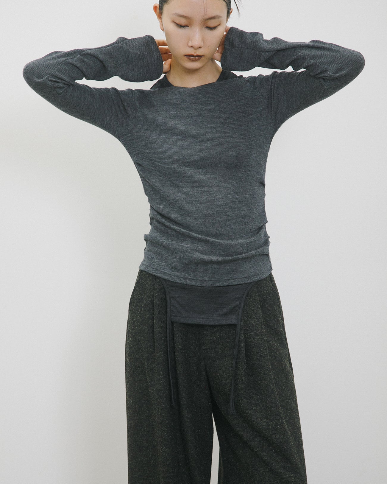 ノースリーブのインナーに、長袖のラグラントップスを重ねて着用できます。 ラグランは広めのボートネックで、オフショルダーとしても着用可能。 それぞれ単品でも着回せるアイテムです。 表地:毛100% A layered design top combining jersey and ribbed fabrics. The set includes a sleeveless inner top and a long-sleeve raglan top that can be worn over it. The raglan features a wide boat neckline, allowing it to be styled off-the-shoulder as well. Each piece can also be worn separately, making it a versatile addition to your wardrobe. Main Fabric: Wool 100% |
