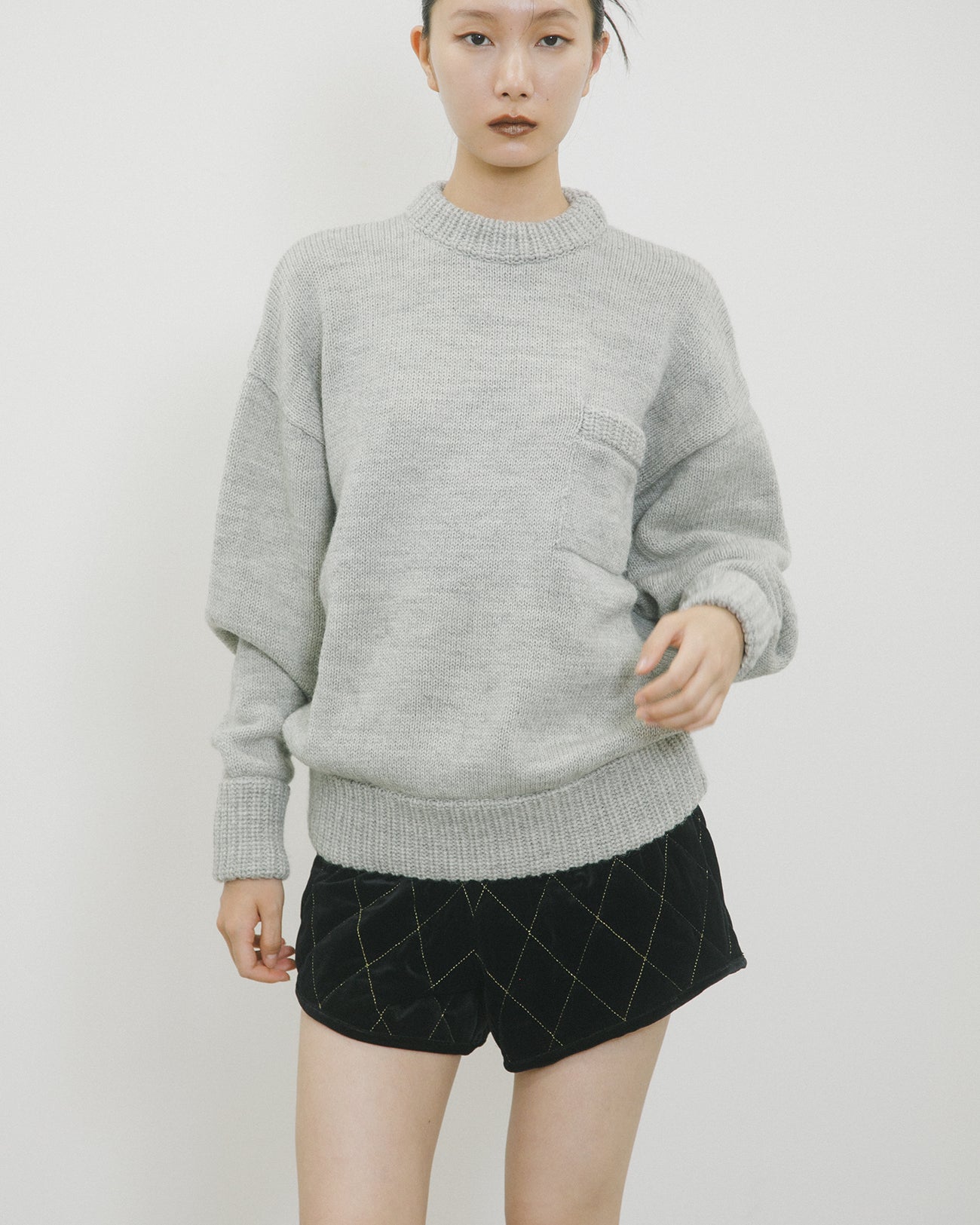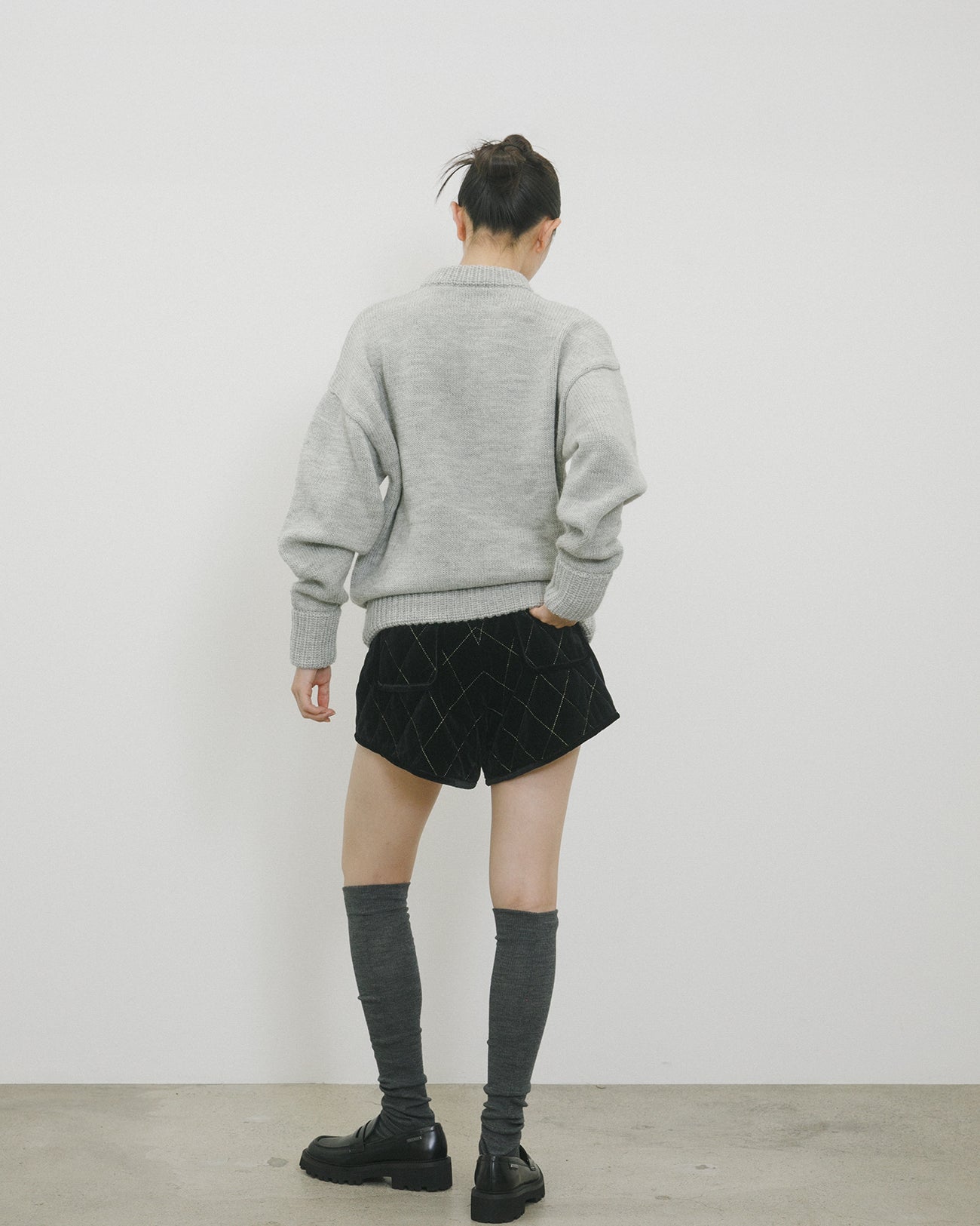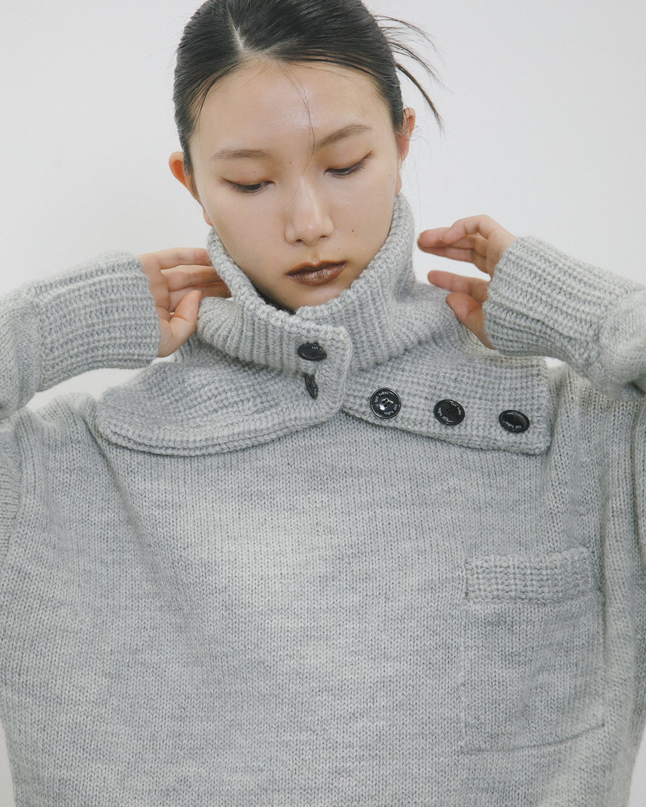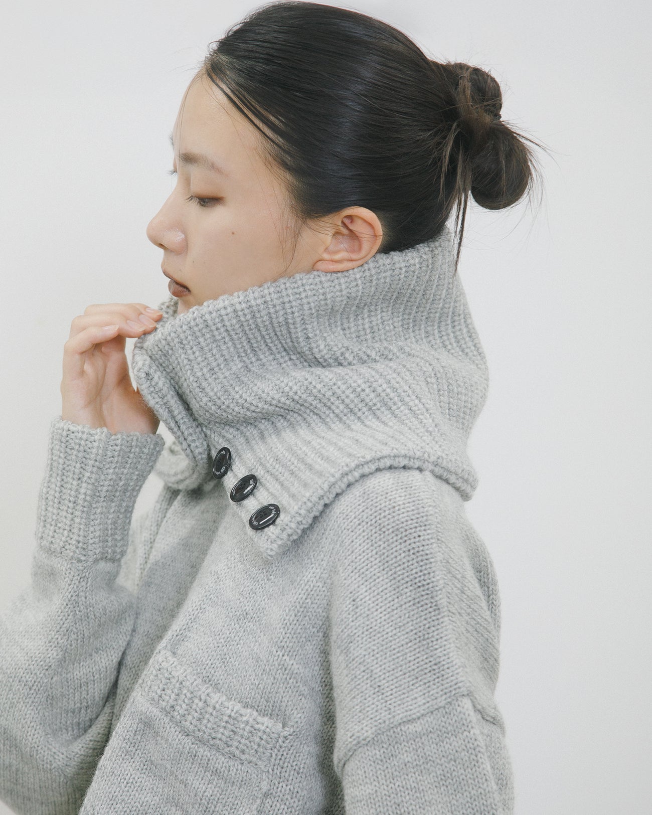 リブ部分が厚みのある畦編みになっているのでコロンとしており、見頃の編み地とのコントラストが効いたデザインがポイント。 ネックウォーマーだけでの使用も可能です。 表地:毛100% A pullover with a detachable neck warmer, crafted from bulky yarn for a cozy look. The rib sections are knitted in a thick fisherman’s rib, giving it a rounded, voluminous feel that contrasts beautifully with the body’s stitch pattern. The neck warmer can also be worn on its own, offering versatile styling options. Main Fabric: Wool 100% |