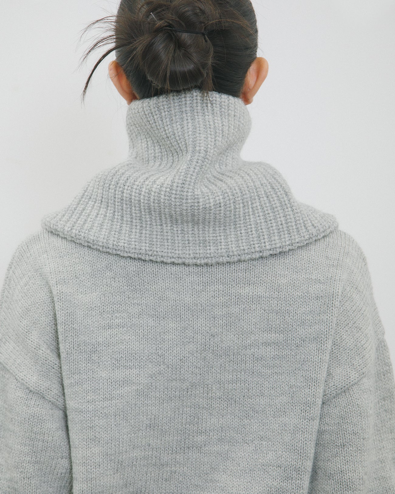 バルキー感のある糸を使用したネックウォーマー付きのプルオーバー。
