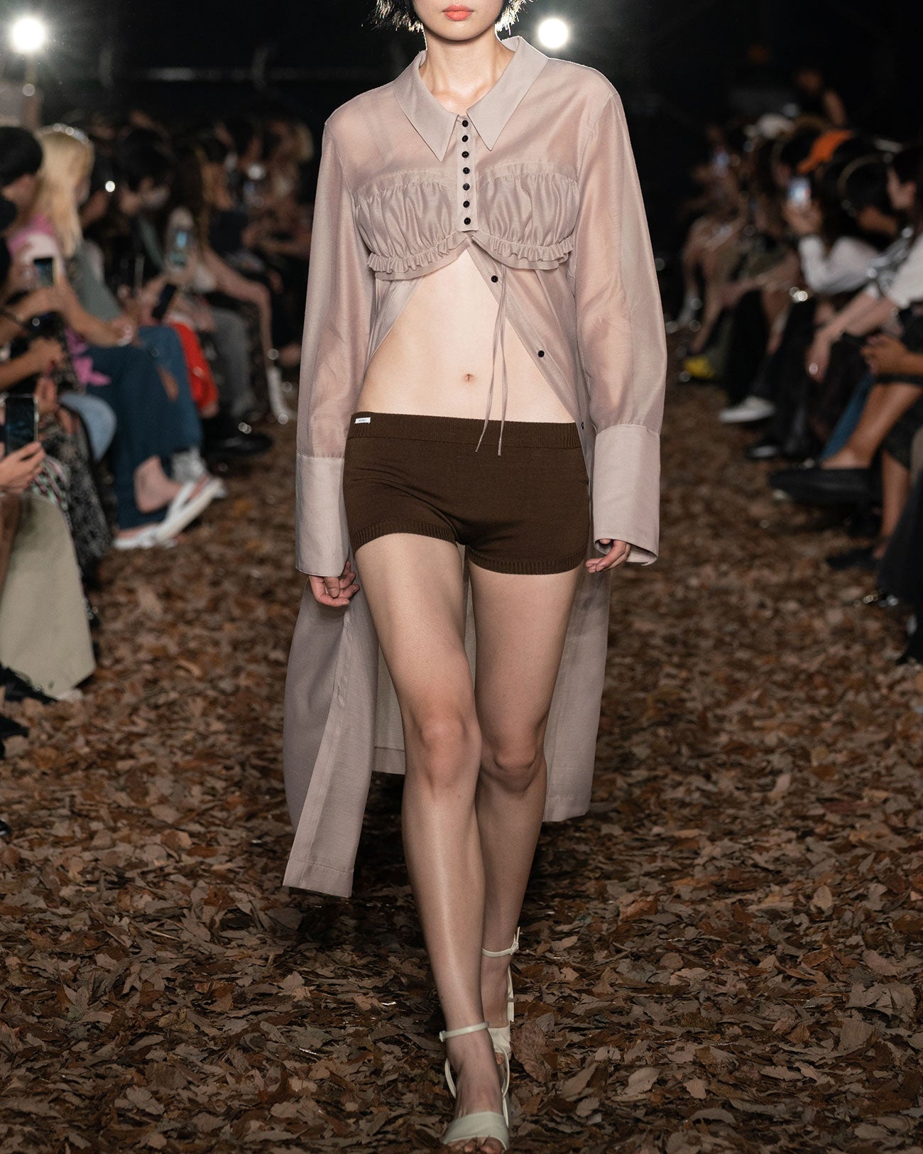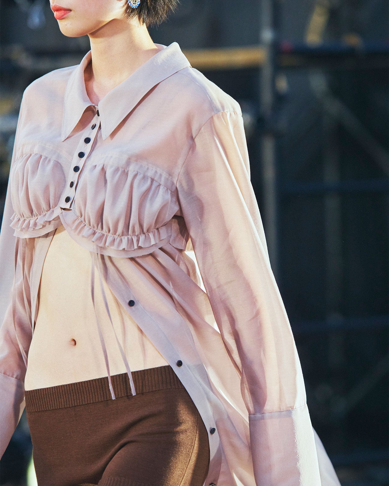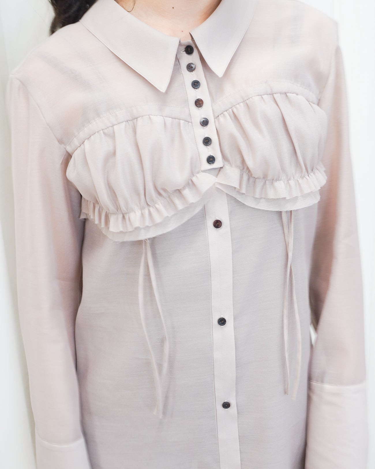 シアー素材を使用したパジャマシャツコンビネゾン。