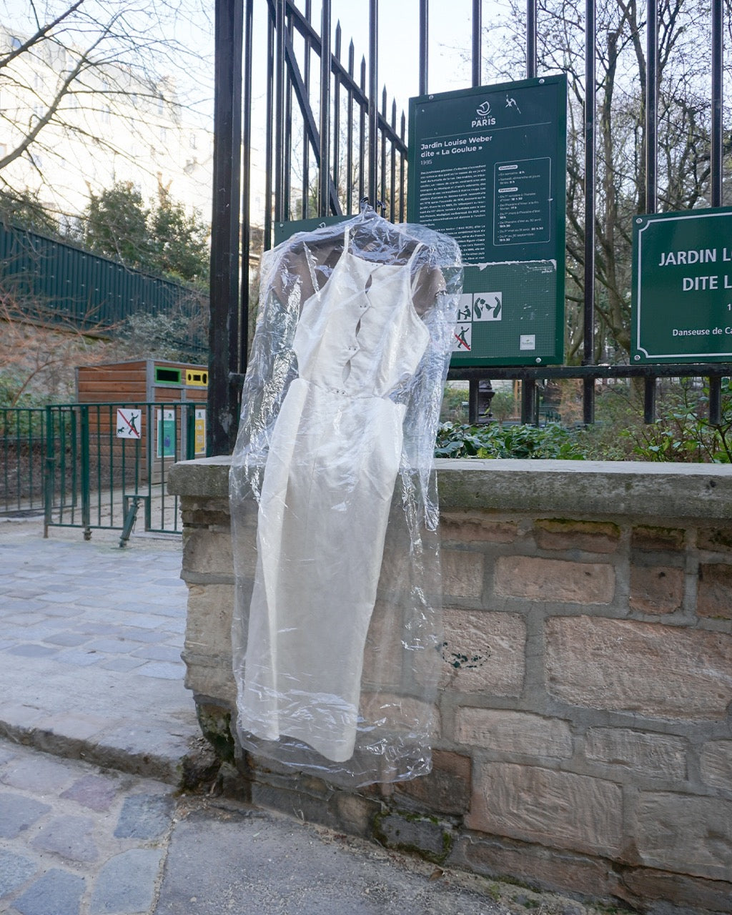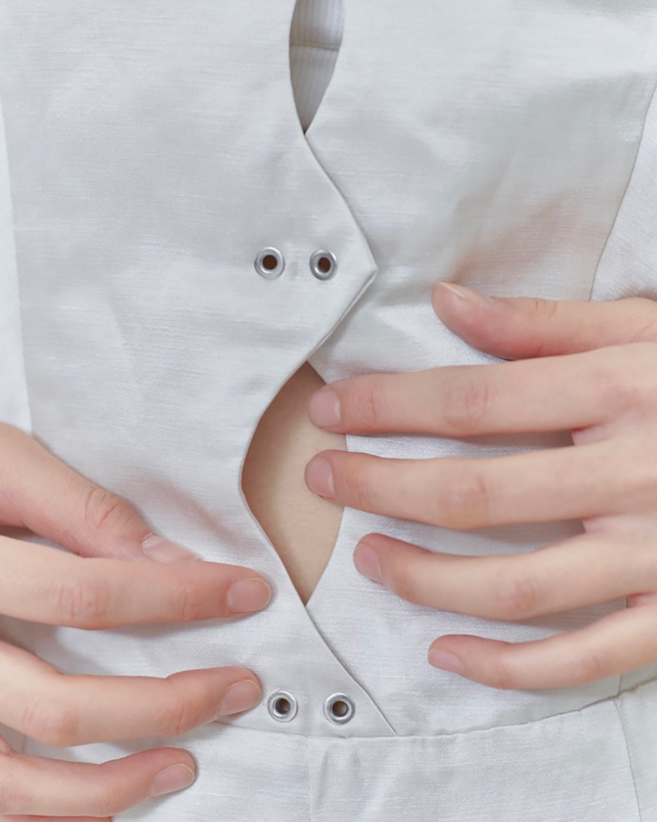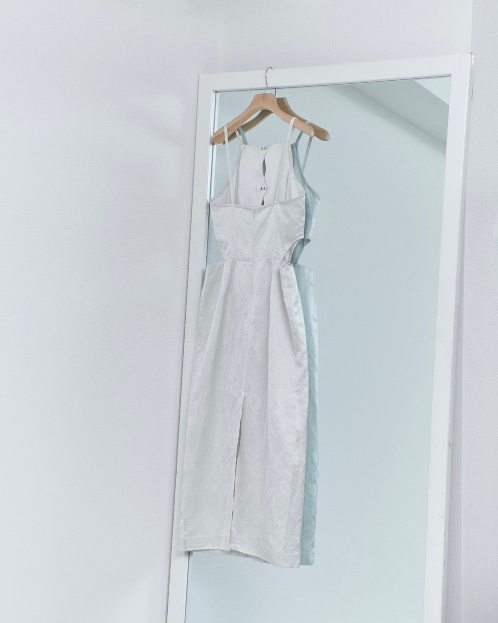 A dress made from a slightly natural-looking blend of linen and satin fabric. It features a front slit and eyelet design, with a side cut line that evokes a high-leg style, giving it a mature impression. The back also has a deep slit, allowing for ease of movement.