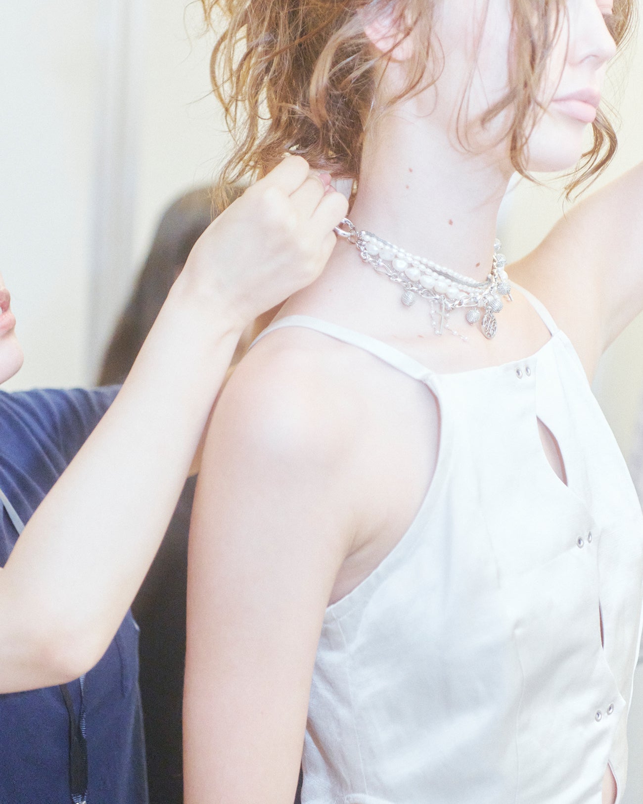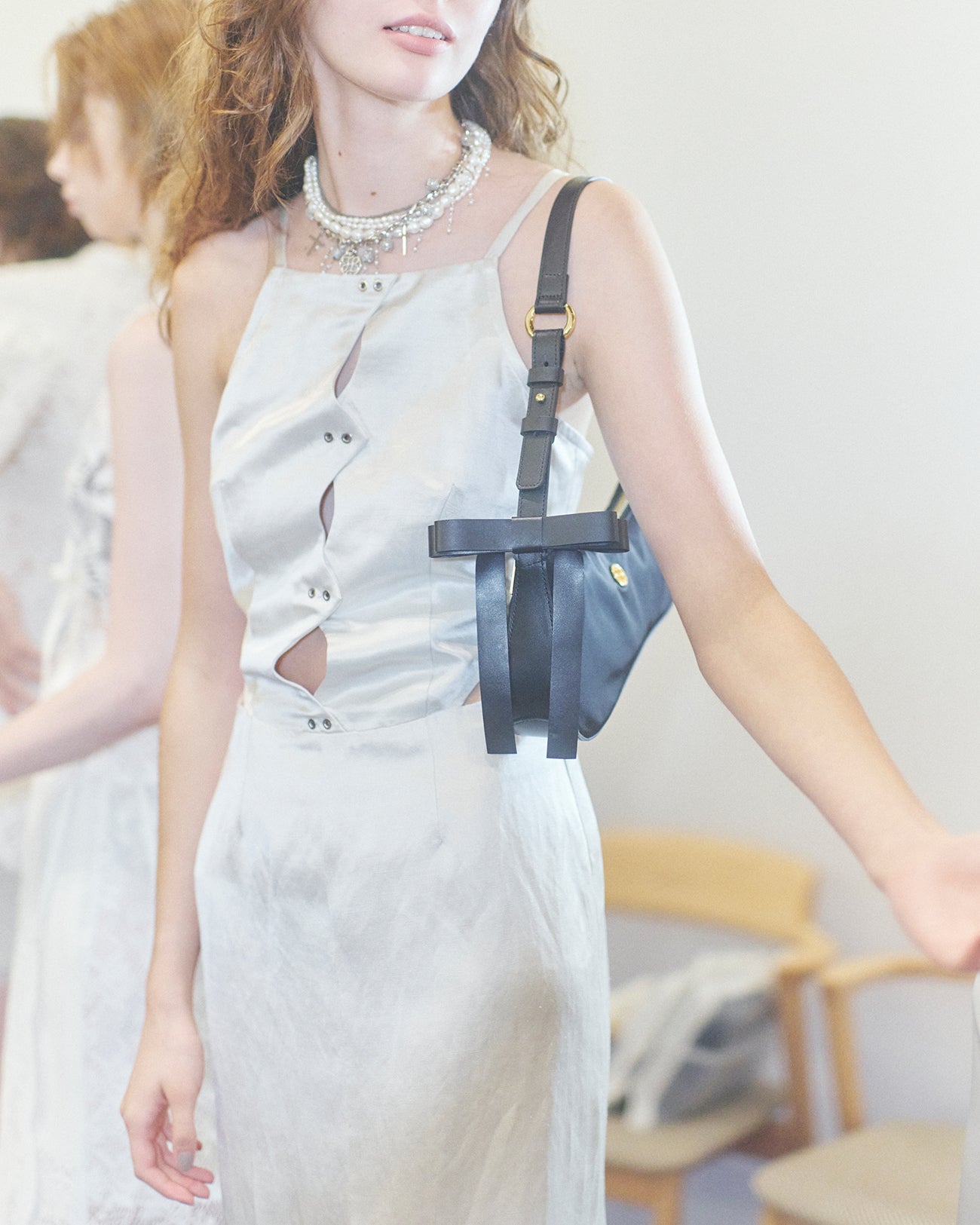 ややナチュラルな印象の麻混のサテン生地を使用したドレス。