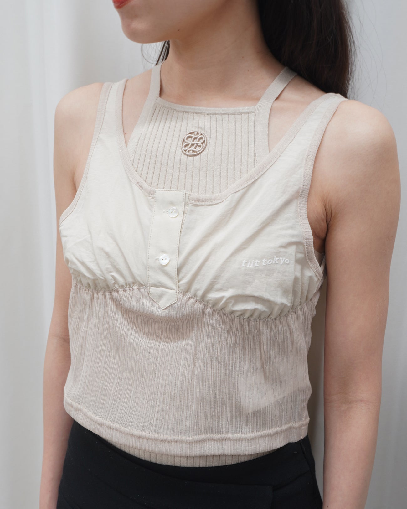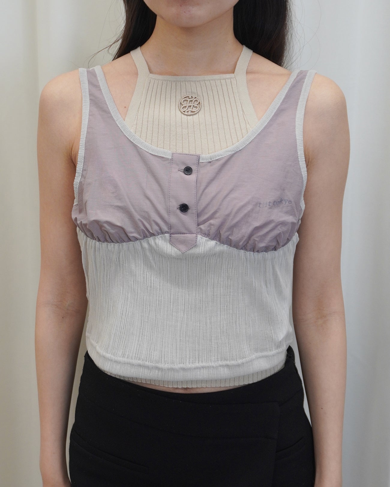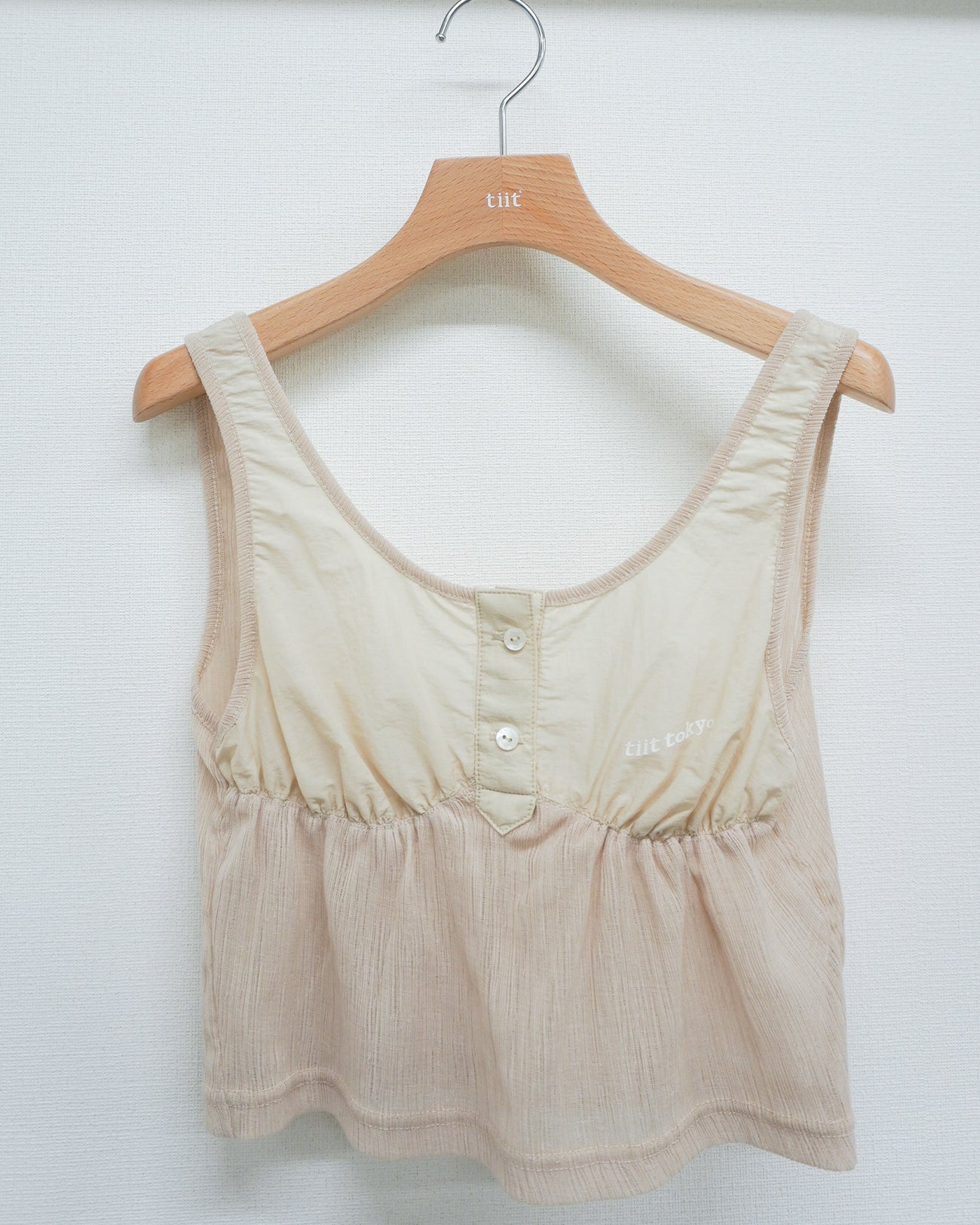 シアーのリブ素材とマットな素材をドッキングさせたデザインがポイントのタンクトップ。