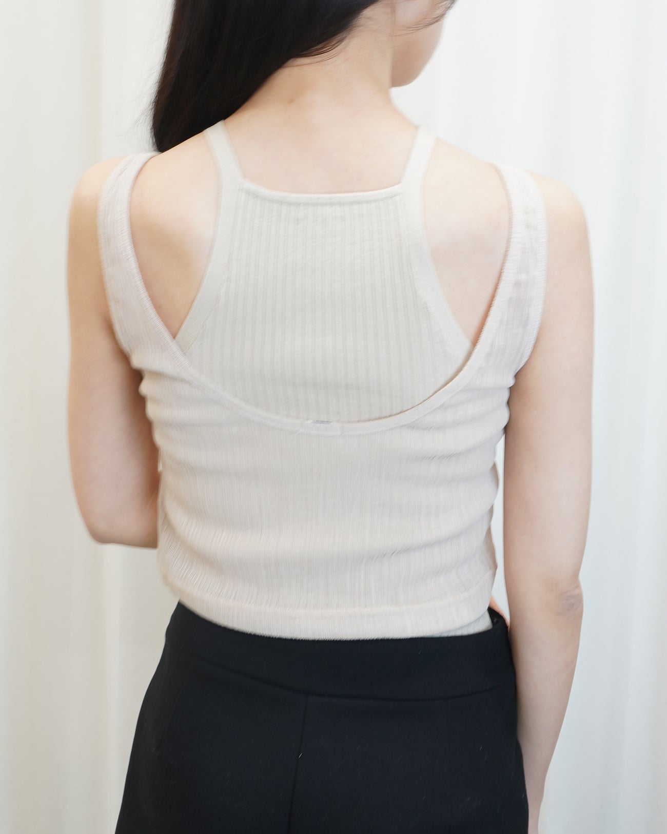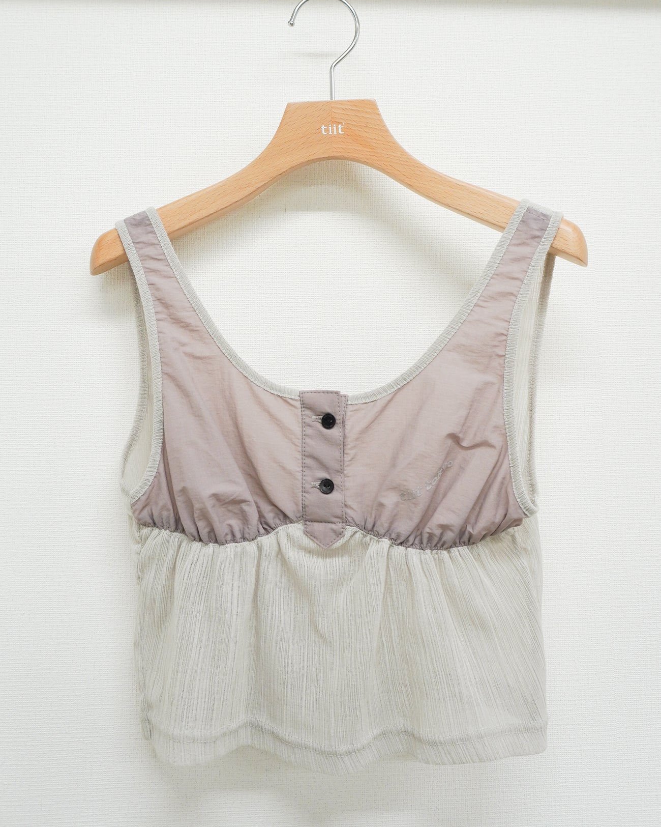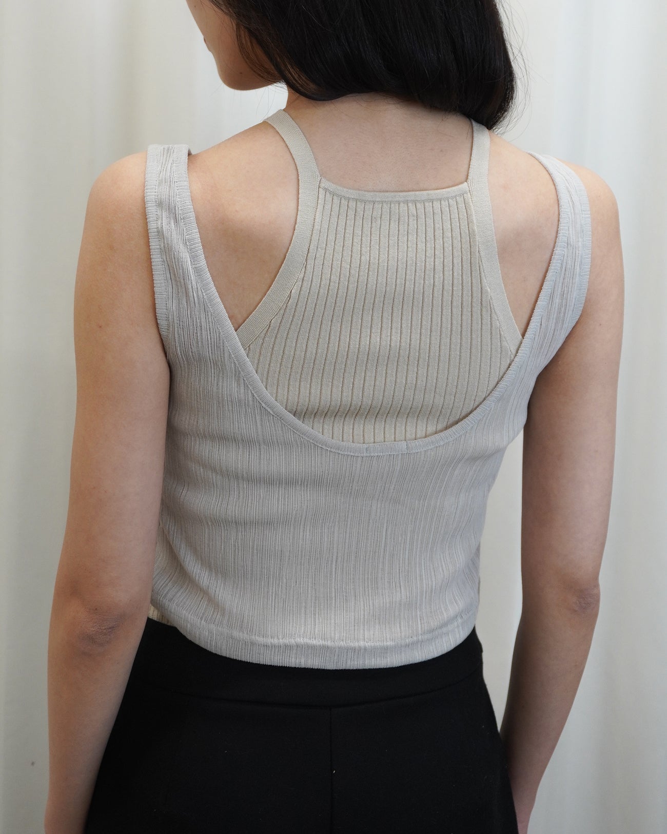 シアーのリブ素材とマットな素材をドッキングさせたデザインがポイントのタンクトップ。