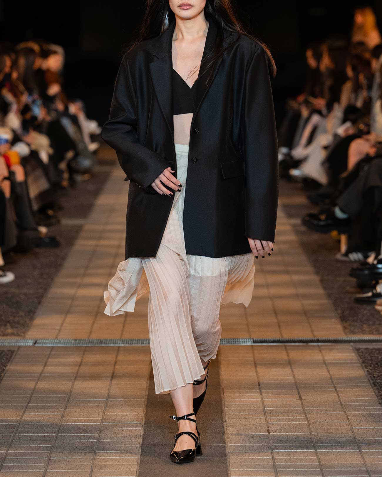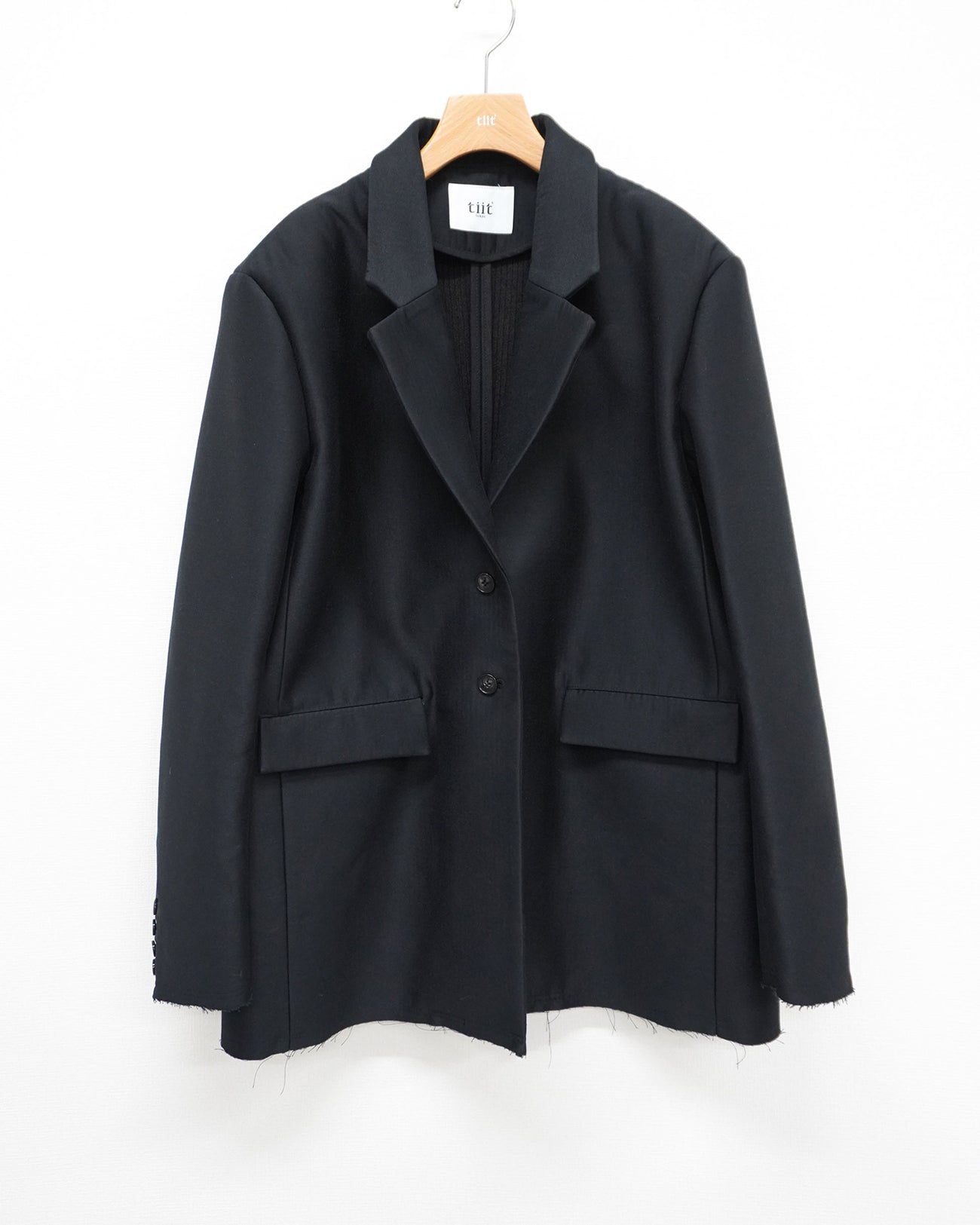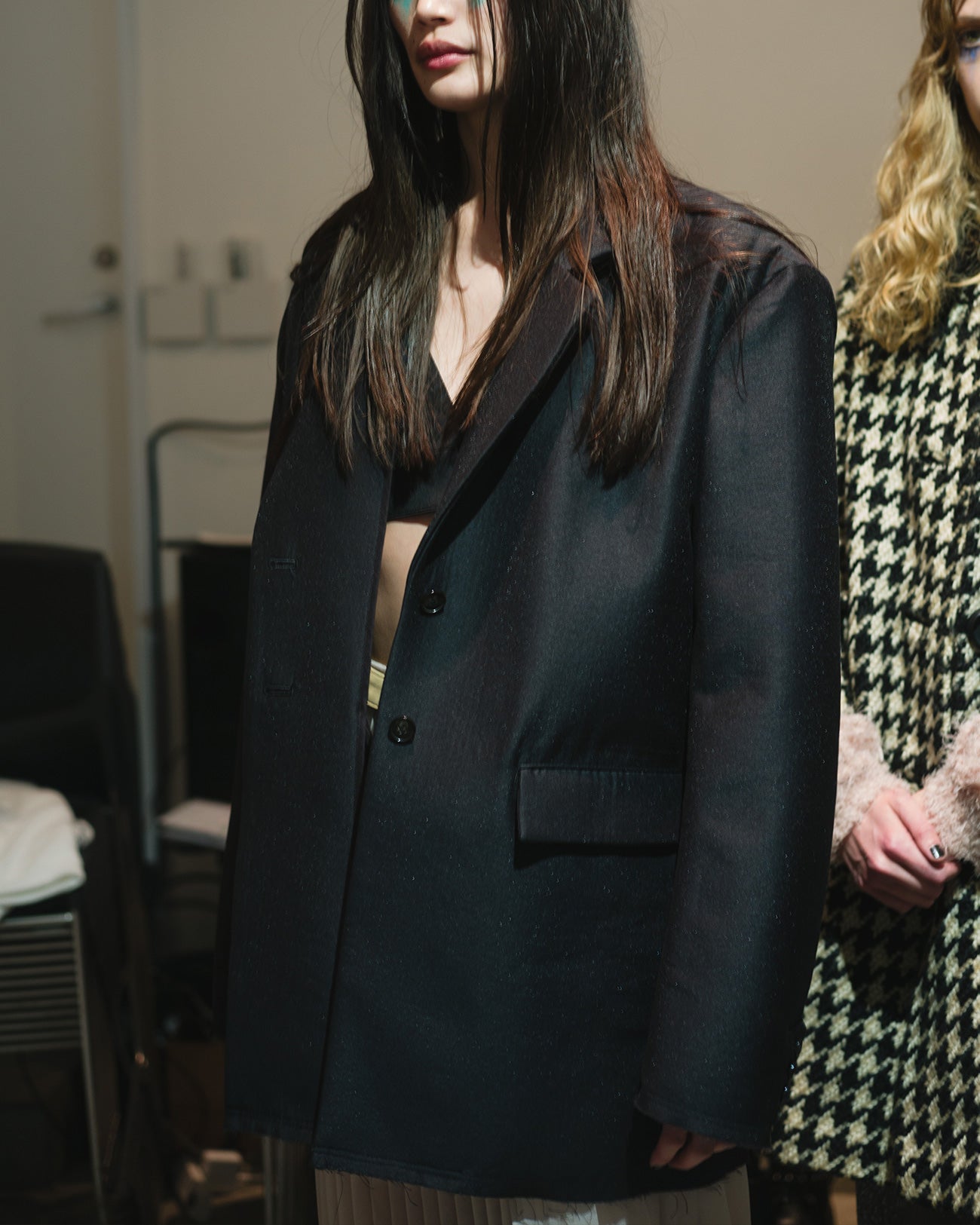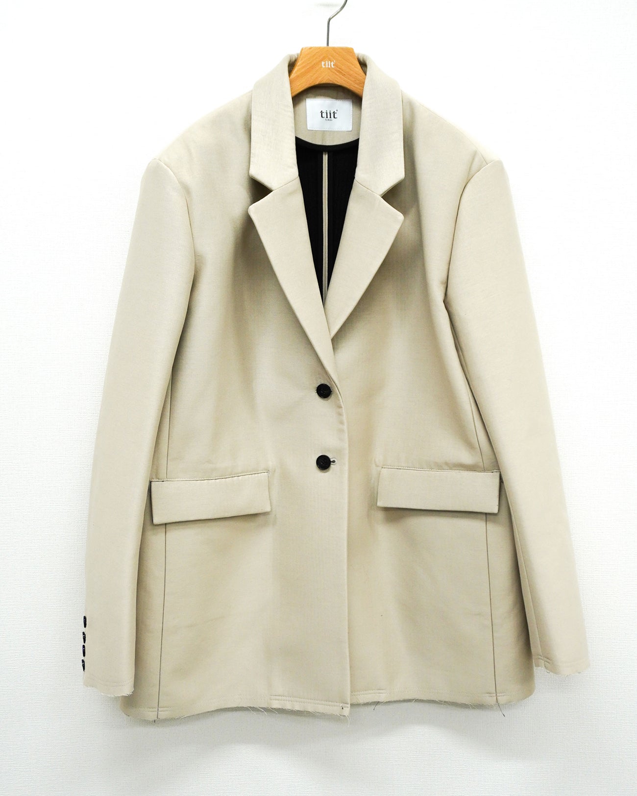An oversized jacket made from original bonding fabric. The outer layer is made of polyester twill, while the inner layer features a wool-blend knit fabric, providing warmth despite its single-layer construction. The seams are finished with piping, ensuring a very meticulous craftsmanship. It has a wide box silhouette with slightly thinner shoulder pads, and the cuffs and hem are cut-off for a casual impression. This item is easy to style for both a polished look and a more masculine aesthetic. It is also recommended to wear it as a set with the matching bonding high waist short pants made from the same material.
