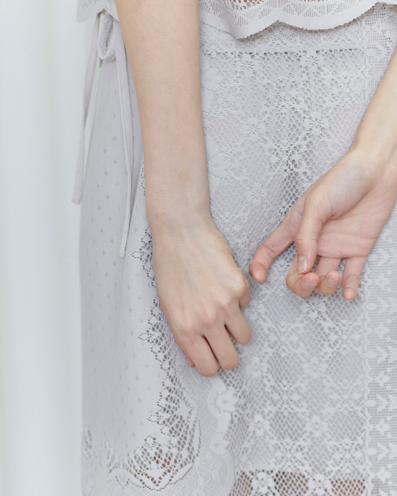 A skirt made from vintage-style panel lace fabric. It features a wrap skirt design with a tight silhouette, but includes a slit on the inside for ease of movement. This item comes with a petticoat, making it easy to wear.
